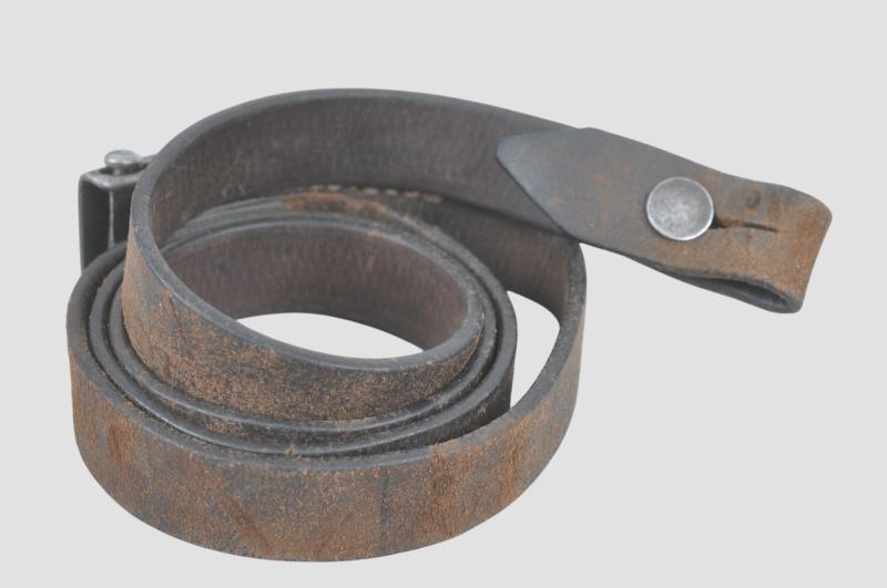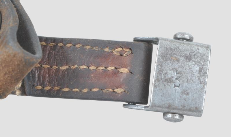 WW2 German MP40 sling with two eye holes as true MP40 slings should be. Maker initials 'L&F' to the buckle for the known maker L&F for Linden & Funke KG, Iserlohn.
