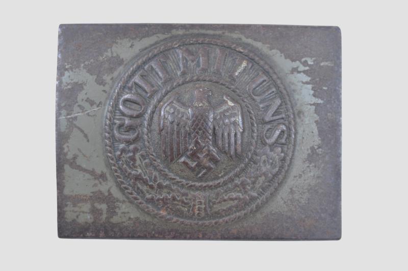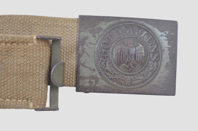 A late war German army belt set with webbing belt having reed green steel hook matching the buckle of the same colour.