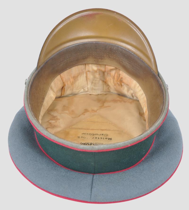 The carmine piped Staff Officers cap is distinctively different from the red waffenfarbe of artillery when placed side by side. Constructed from fine quality doeskin wool it has silver bullion eagle & cockade , both originally stitched to the cap . Interior has celluloid diamond with maker name 'Hammaburg' & 'Meisterstuck Extraklasse' referring to its expensive high quality specification as provided by the tailor who made it to 'Extraklasse' standards. The champagne lining matches the underside of the cross hatched peak with perforations to forehead area of the sweatband intended to aid in ventilation when worn. To the underside of the peak can be seen the thumb print of the wearer from repeated wear of the cap.