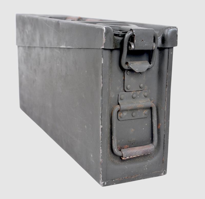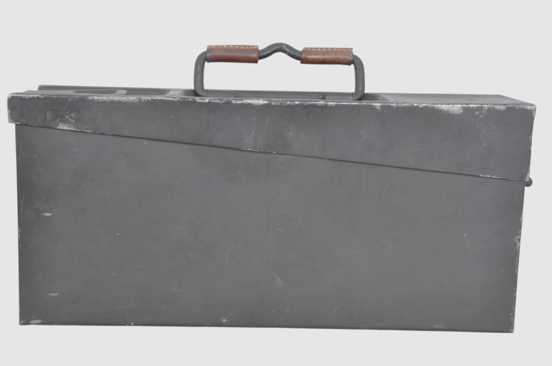 Steel machine gun ammunition tin with a high proportion of its factory grey paint remianing & eagle & swastika marking to lid with date '1943'. Retains all of its leather tabs.