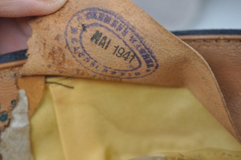 Cap is double marked to both sweatband & liner with gold etched wording 'Luftwaffe , Berlin SW68 First Class ( Braunschweig) ' referring to the Kleiderklasse of cap that could be purchased by the officer direct from the Luftwaffe & paid off in instalments with the use of a book in which the payments were recorded by the officer. The wording 'Stirndruckfrei' ( genuine free of forehead pressure ) & patents underneath this denote use of the system which took pressure off of the forehead & could be purchased at extra expense. Top quality melton wool finish with high saddle shape & bullion insignia professionally handsewn to the cap. There is a tear to the sweatband however this allows us to see the ink stamped date of 1941 to underside of the leather .