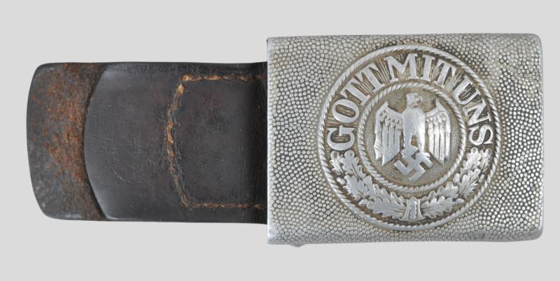 A German army belt & buckle with aluminium buckle having belt tab which is dated 1939. Belt leather dated 1940 & both apparently having been together for a very long time. Faint maker markings to buckle tab.