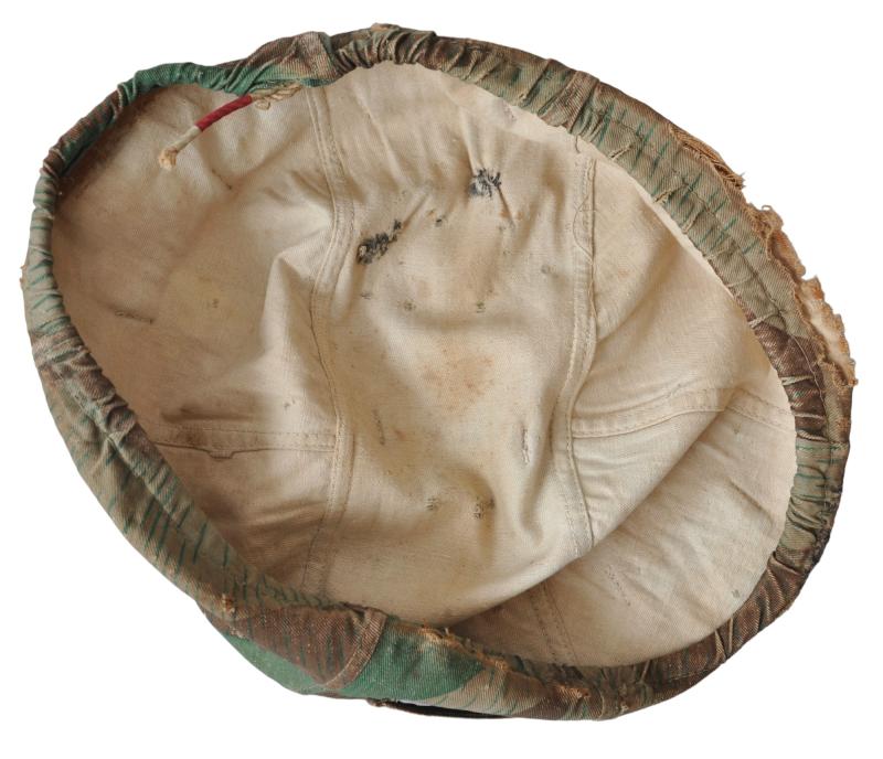 A cover that has its foliage loops still intact & showing some excessive wear & a stress tear to helmet rim area from extensive field use. Tightening cord is a replacement which was fitted to the cover when recently acquired.
