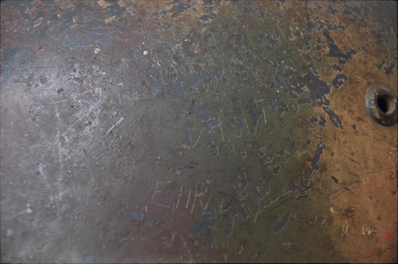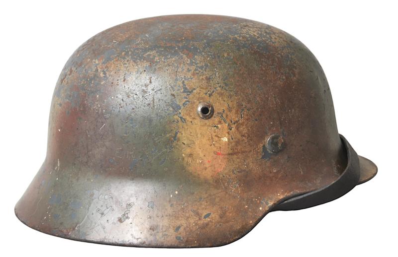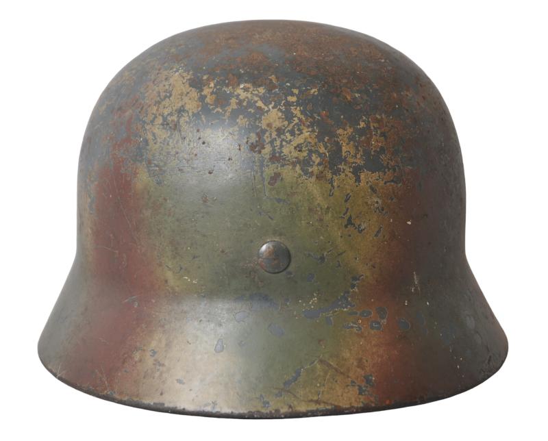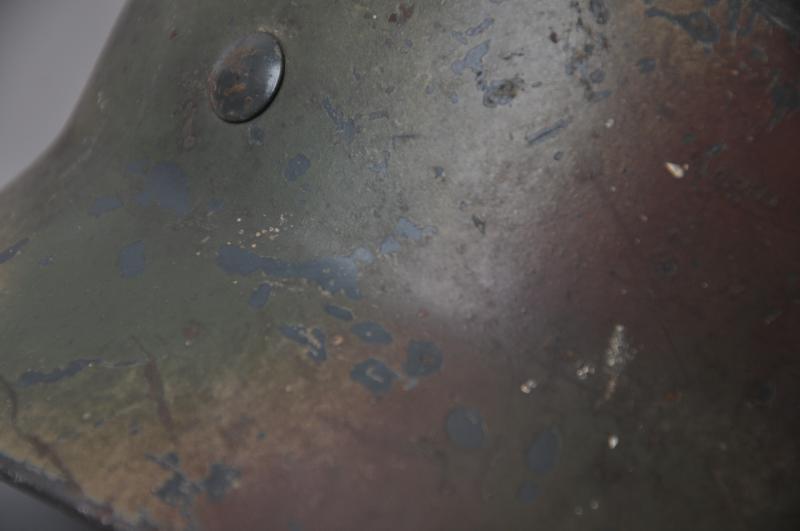 A Luftwaffe M35 double decal camoufage helmet with its second pattern Luftwaffe eagle painted around & national shield still visible under the paint on opposite side.