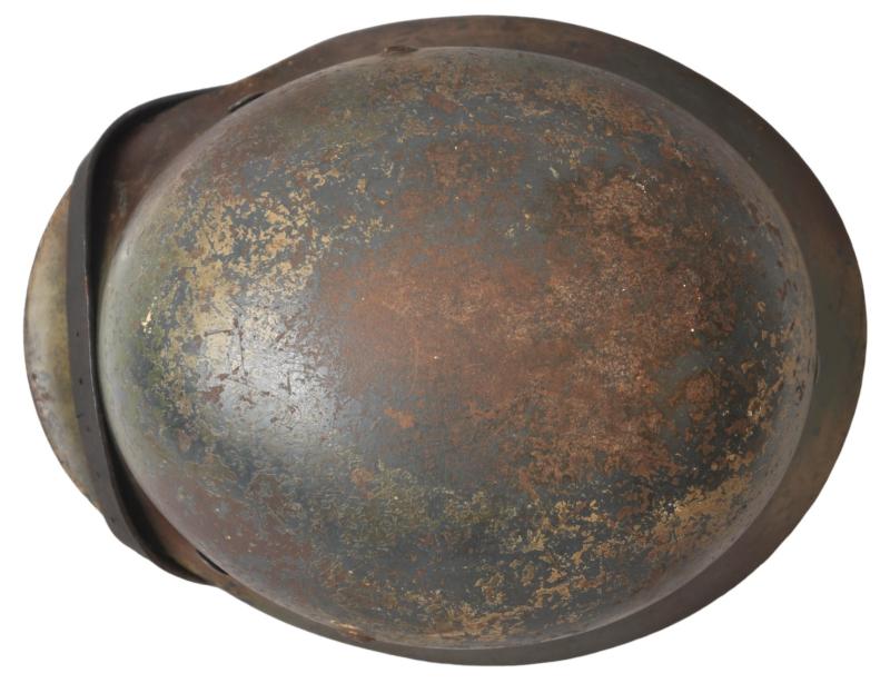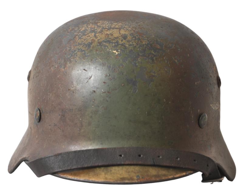 A large sized '66' helmet this classic camouflage pattern is of three tone with reddish brown , forest green & tan ochre having been applied over its factory blue paint finish. These colours are still distinctive with the Luftwaffe factory blue visible in places. The Luft eagle has painted around & not 'dug out' with the national shield still present underneath the tan ochre camouflage paint that lightly covers it. There is some writing scratched into the paint on the shield this believed to be from the US veteran who brought it back. All three liner rivets are totally original to the helmet with matching camouflage paint visible on each. Underside of rim bears the factory code & size 'SE66' with lot number '101' . The reinforced aluminium liner is Berlin maker marked & dated 1938. Liner appears to have received an application of leather preserver at some point in its life. Original tightening string still present to tongues. Chinstrap is of the correct brown luftwaffe issue with Dresden maker to pointed end & date 1938.