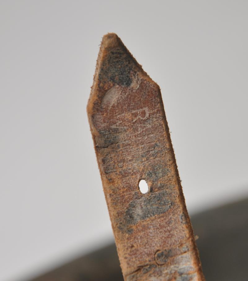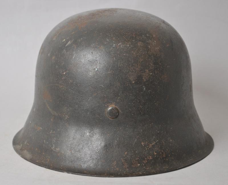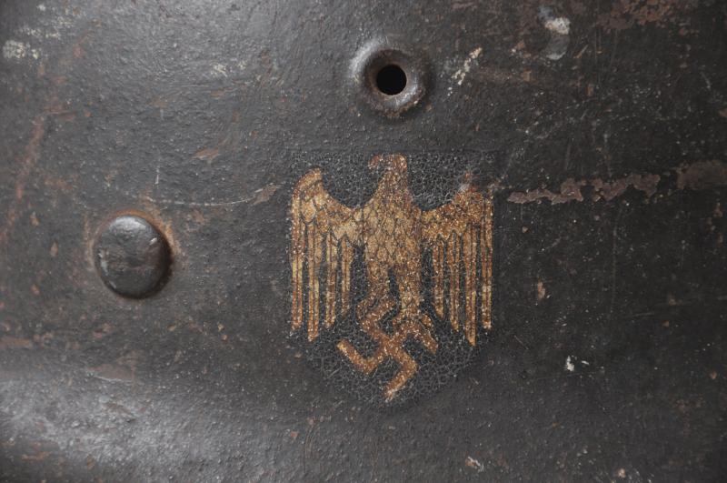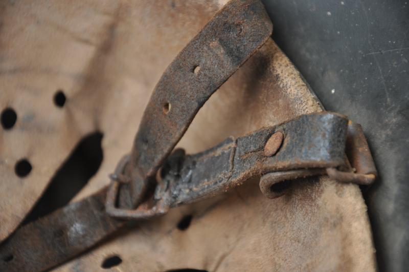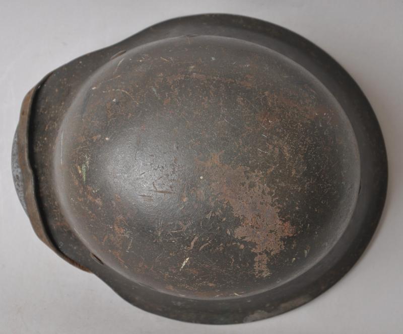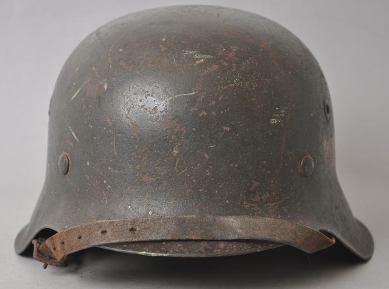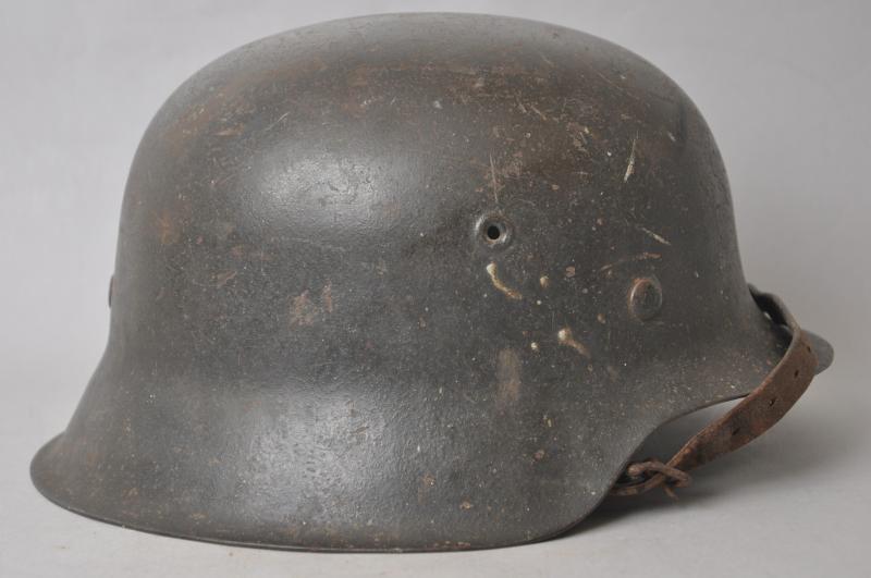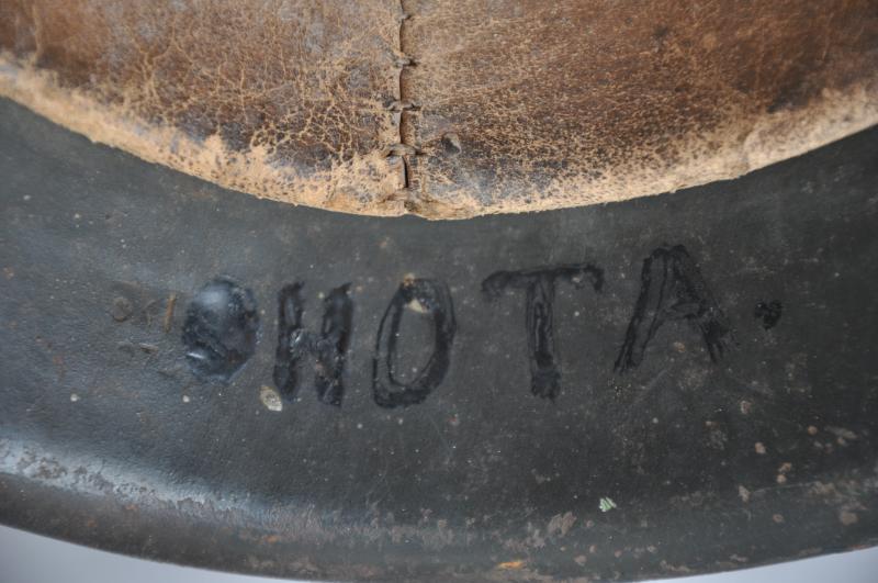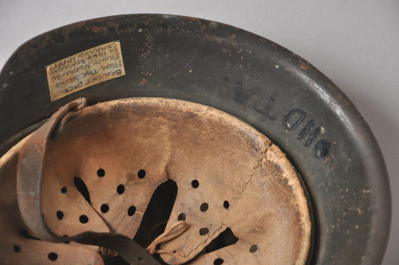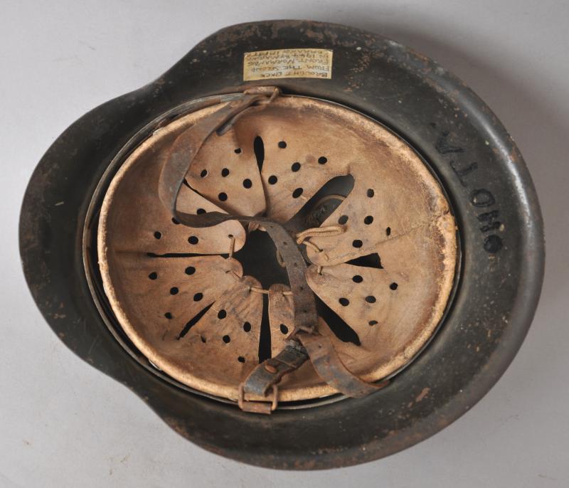 Helmet is finished in slate grey with good proportion of army decal remaining. To underside of rim is the name of the soldier in in large handpainted letters which appears to be ' OHOTA ' quite possibly relating to one of the many foreign troops manning defences whilst serving in the Wehrmacht during the Normandy Landings. This has mostly obscured the markings on the shell however appears to be 'ckl' with a size of 64 or 66. The original chinstrap is still present with faint markings to end . The short buckle strap has some minor corrosion to one end.