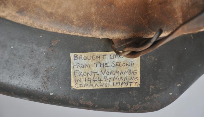 A textbook single decal Army M42 raw edge helmet with capture label to underside of rim reading ' BROUGHT BACK FROM THE SECOND FRONT -NORMANDIE IN 1944 BY MARINE COMMANDO IMPETT' . This may well relate to a French commando ( No.4) as well as British.