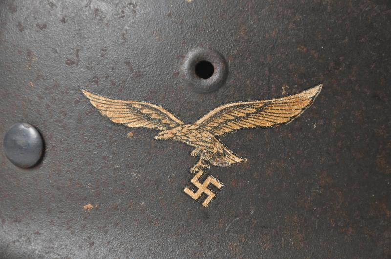 The luftwaffe 'dotted wing' decal is recorded as correct for the manufacturer 'SE' as here. Its distinctions , compared to decals on other helmets, are the downward turned eyebrow & flatter chest ( See Pg 94 Helmet Decals of the Third Reich By Ken Niewiarowicz ) .