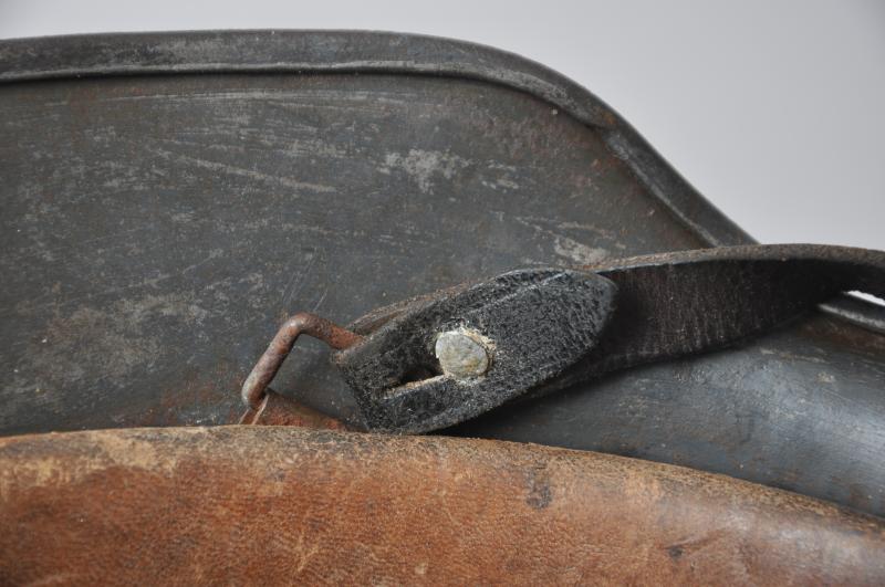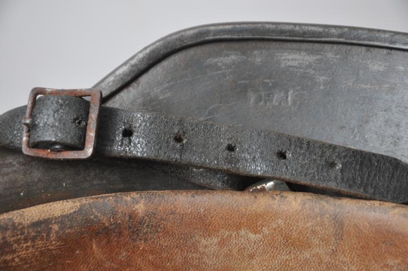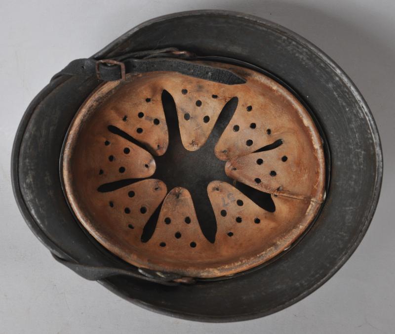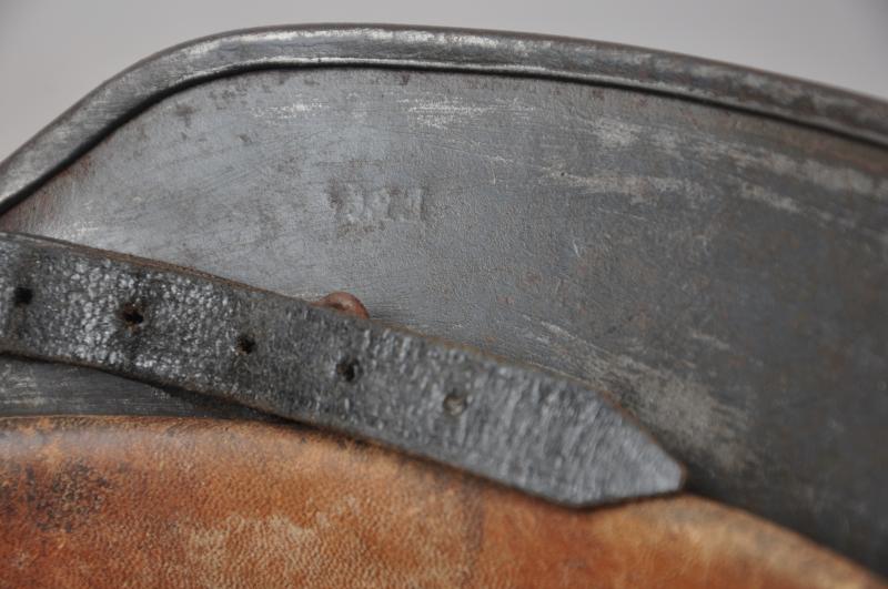Condition wise this helmet has been in the shed for many years however is in surprisingly excellent condition. The decal is nearly 100% intact & the factory blue grey paint of the outer shell shows only minor rust age upon close examination. All three liner pins retain their blue factory paint these again being nearly 100% intact. The underside of the helmet rim was cleaned by the previous owner with a minor abrasive & the fresh rust of the chinstrap fittings given a wipe over. The chinstrap has never been off of the helmet & is maker marked to the firm Hermann & Sohne . It is dated however it has been stamped off centre so only the top part of the date can be seen. There is a small 'nick' to one edge of the long strap & I am unable to unbuckle it due to it having been in this position for many years & now stiff with the ageing of the metal.