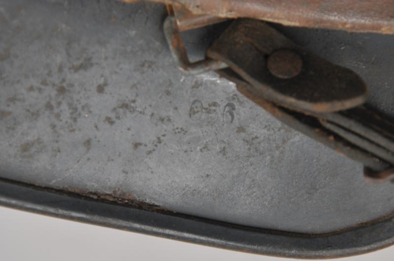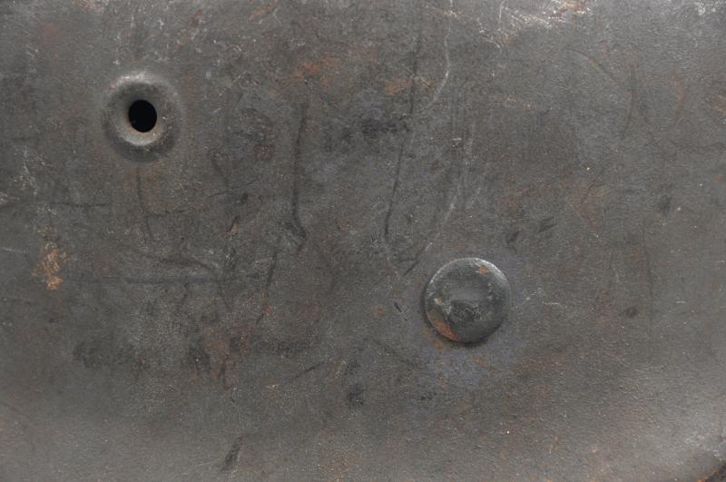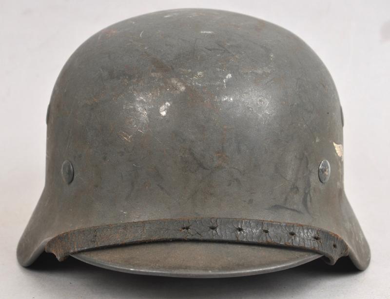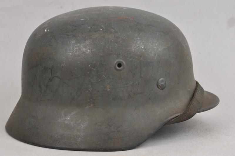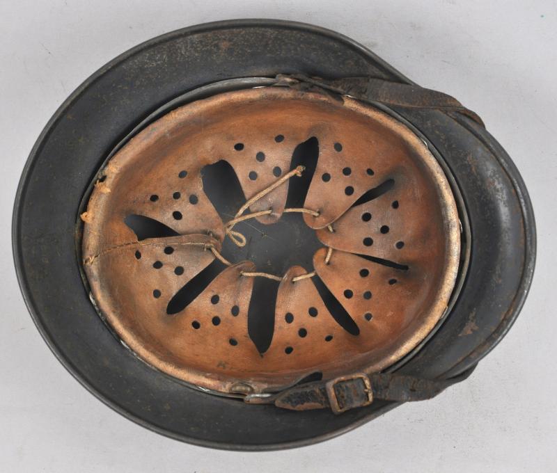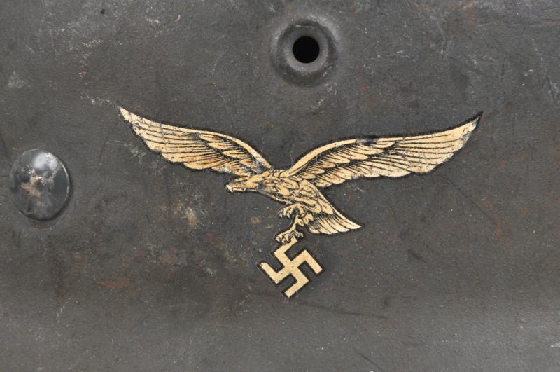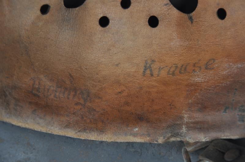 Helmet has a good 95% intact second pattern Luftwaffe eagle with rough textured blue grey Luftwaffe paint as per 1940 orders. Underside of rim gives 'Q' maker mark for the firm 'Quist' with size '66'. Lot number to rear '4808'. All of the liner pins are undisturbed this liner having never been out of the helmet.The sheepskin leather is in excellent condition with no damaged areas & the additional interest factor of two different names handwritten to the leather in the distinctive German style of writing. Chinstrap has grey painted steel buckle with faint maker to pointed end.