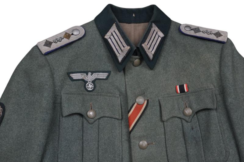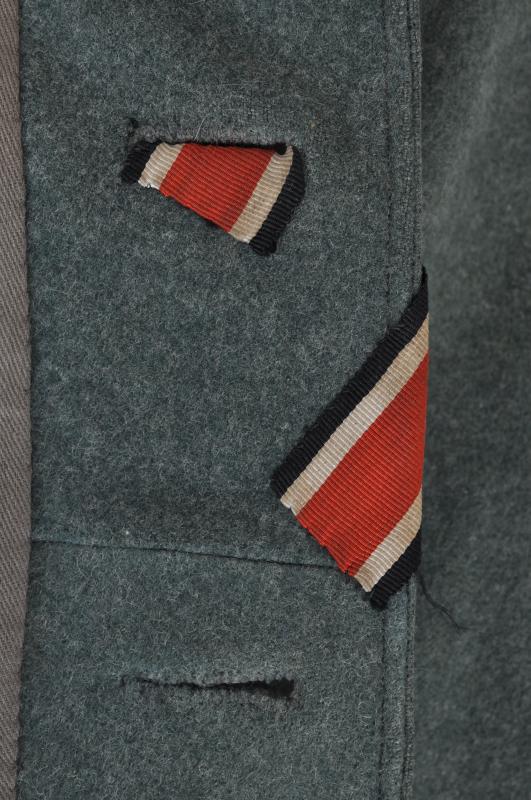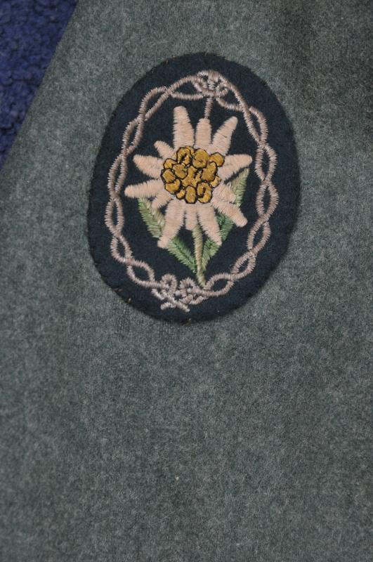 German officers were required to purchase their own uniforms the quality of which dependant on their budget. This tunic is in classic early green grey wool with officer style pocket flaps & cornflower blue piped bullion collar tabs. The breast eagle is also of bullion . These are all neatly hand sewn & quite typical of professional tailor application. Looking at the natural buildup of age around the collar tabs & the fine stitching around the well seated eagle I would confidently say that both are originally wartime applied. A second class iron cross ribbon denotes a well served officer & is totally original to the tunic as evidenced by the unweathered fresh cloth underneath which is revealed when the ribbon is pulled back. To the right sleeve is an embroidered mountain troops Edelweiss badge denoting service with a mountain troops regiment .