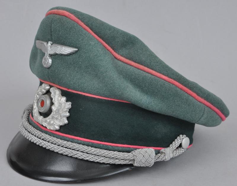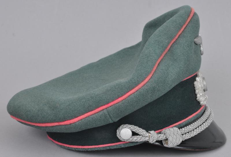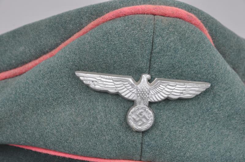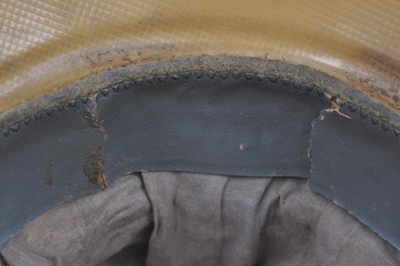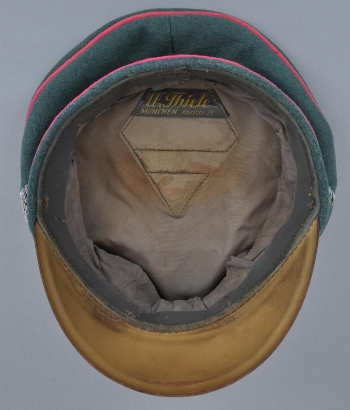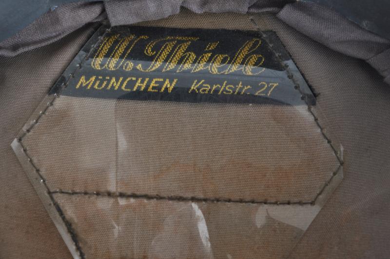 Constructed from fine doeskin wool the caps insignia are in matching 'Leichtmetall' both still firmly affixed to the cap. To the interior of the cap is the earlier style celluloid diamond with retailers name ' W.Thiele Munchen Karlsr.27'. When one examines the cap several features indicate its origins from Pekuro the main one being the velvet band sewn between the sweatband & the cap body this a system designed by Pekuro to relieve pressure on the forehead when in wear. The grey leather sweatband , zig zag stitching & grey rayon lining are also highly typical of Pekuro manufactured caps.