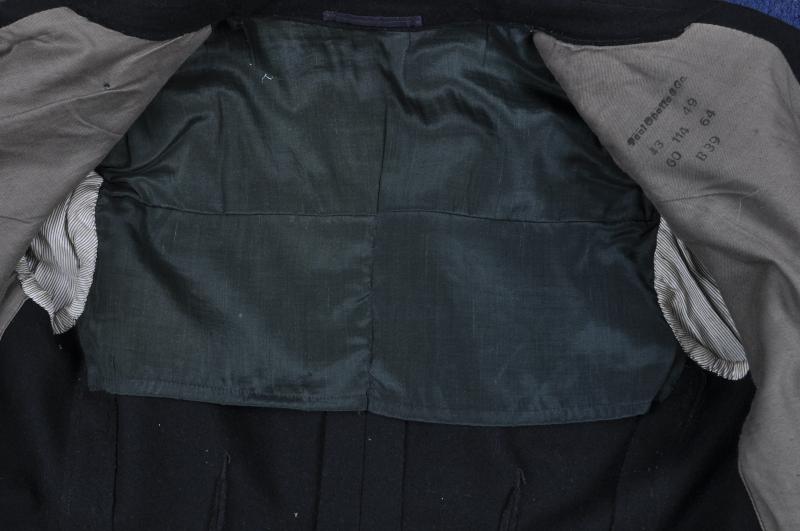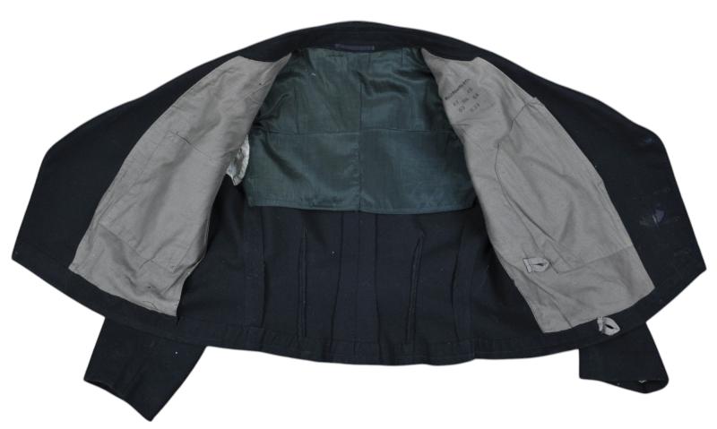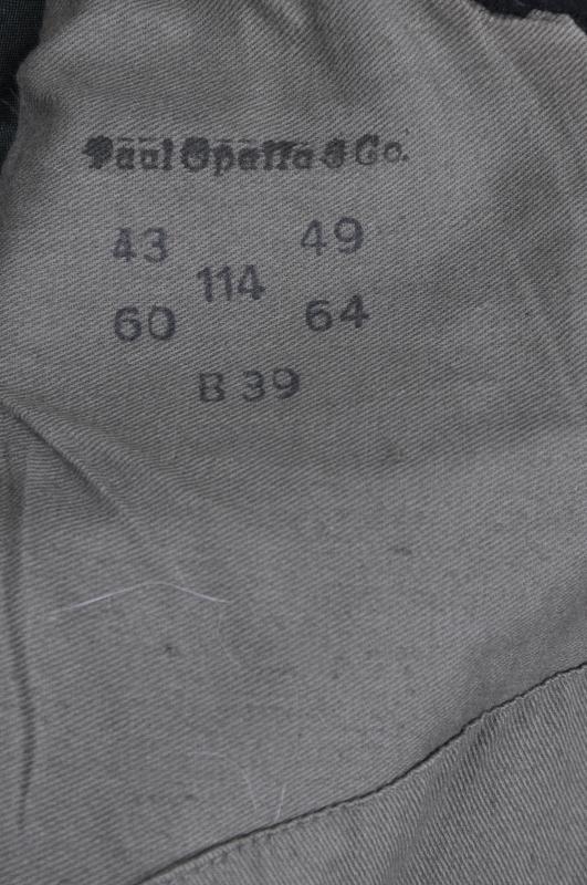 This is a classic issue quality wrapper that has been purchased from stores & officer tailored . Bearing the well known panzer wrapover maker ink stamp for 'Paul Opello & Co' with dice stamped size markings & date 1939 . It has depot prefix 'B' for Berlin. Breast eagle is a silver wired version typical for officers with original collar tabs & skulls still machine stitched in place. Interior has a partial grey twill lining this having been altered slightly with the removal of the back piece ties & a black sateen back piece fitted with striped material placed inside the arms. Interestingly the button holes can still be felt underneath the altered cuff where they have been stitched over & buttons removed.
