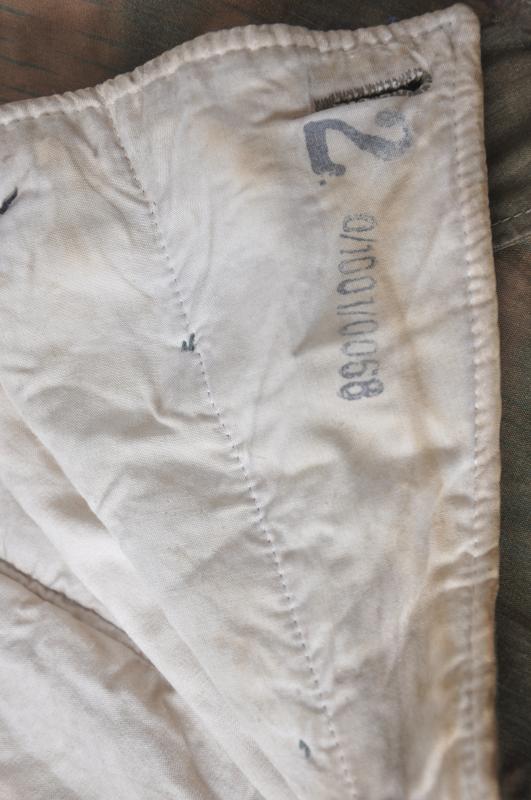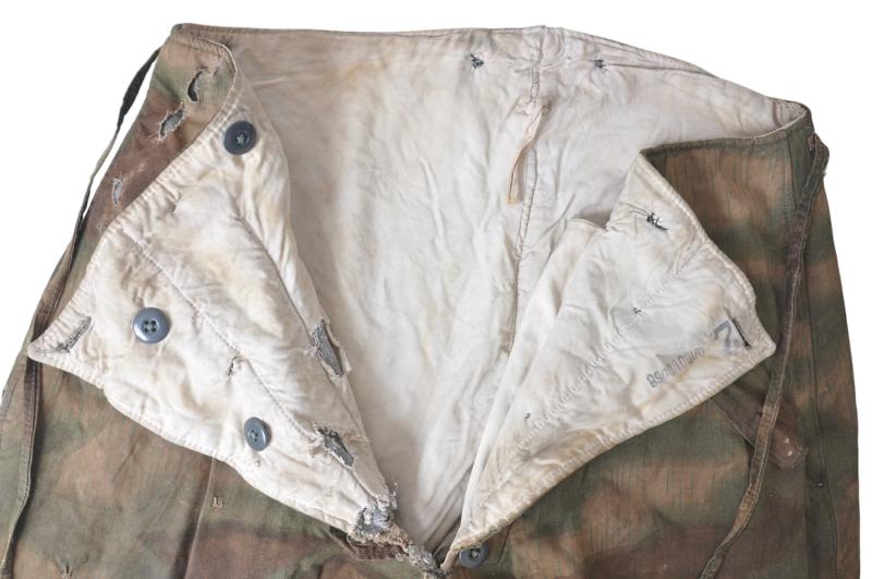 A well worn pair of tan & water camouflage padded winter trousers coming originally from the Ardennes area.
