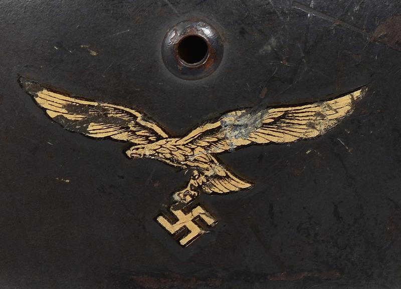 A stunning example of a rare M35 configured double decal Luftwaffe helmet .