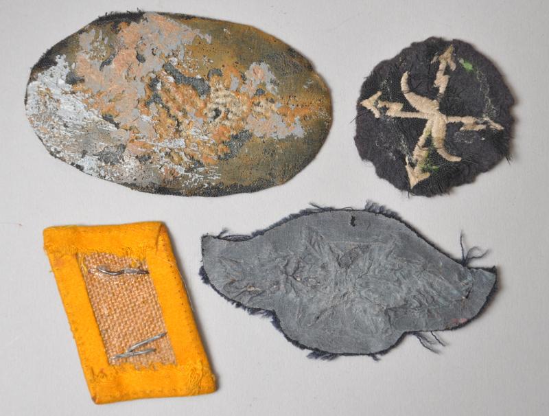 A small grouping of Luftwaffe insignia brought back by a veteran comprising: A collar tab in yellow for a senior corporal of the paratroopers or aircrew Three trade patches , various.