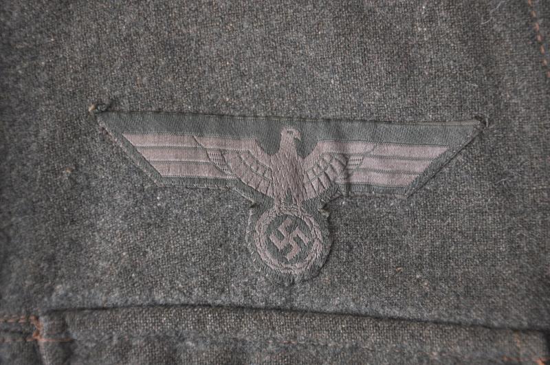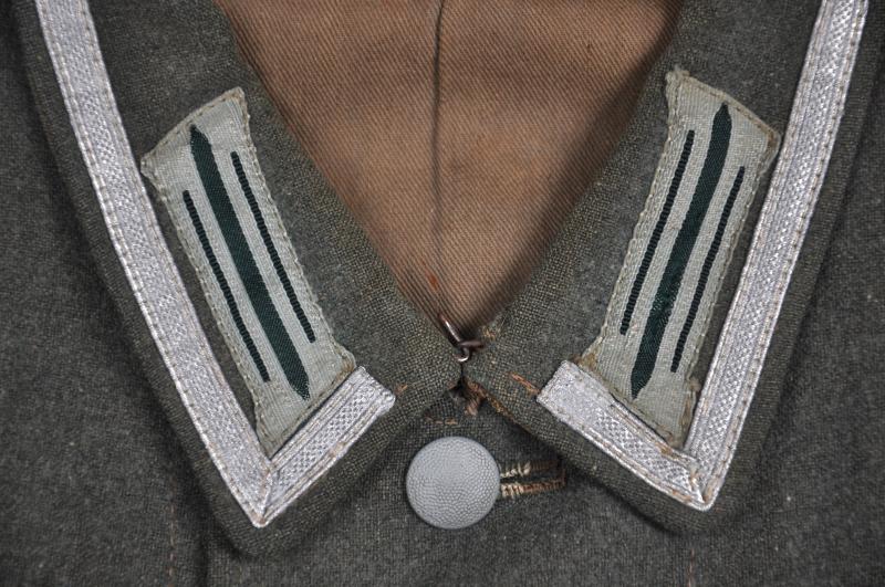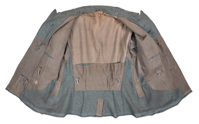 This tunic is of the classic M40 cut , basically the same as its M36 predecessor but now with field grey collar as of 1940. Equipment belt hooks to both front & rear. Tunic has been worn by an Unteroffizier with NCO tress added to collar & universal green on light grey collar litzen seen as of 1940. The bevo breast eagle is very professionally machine sewn to the tunic & has been in situ for a very long time. I have left both shoulder boards on the tunic as it came to me these for rank of Unterfeldwebel with white Infantry piping. Two award loops to left breast pocket. To left arm is sewn a totally original field grey backed Krim shield showing this NCO to be a veteran of the fighting & capture of the Crimean region under Field Marshall Mansteins command in 1941/42 . Interior of tunic is lined, typically, in beige cotton twill with dice stamped size markings & 1940 dated 'Munchen' inspection marking. All three of its original collar liner buttons still present to underside of collar.