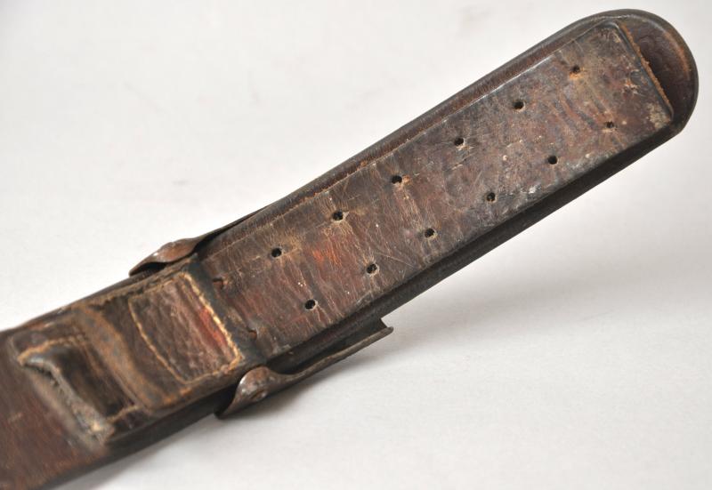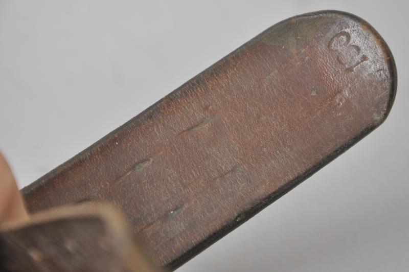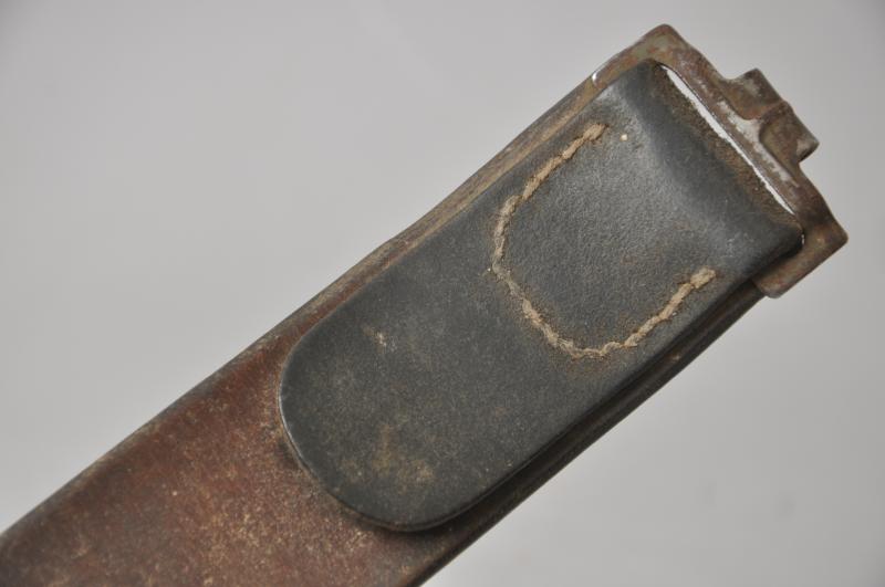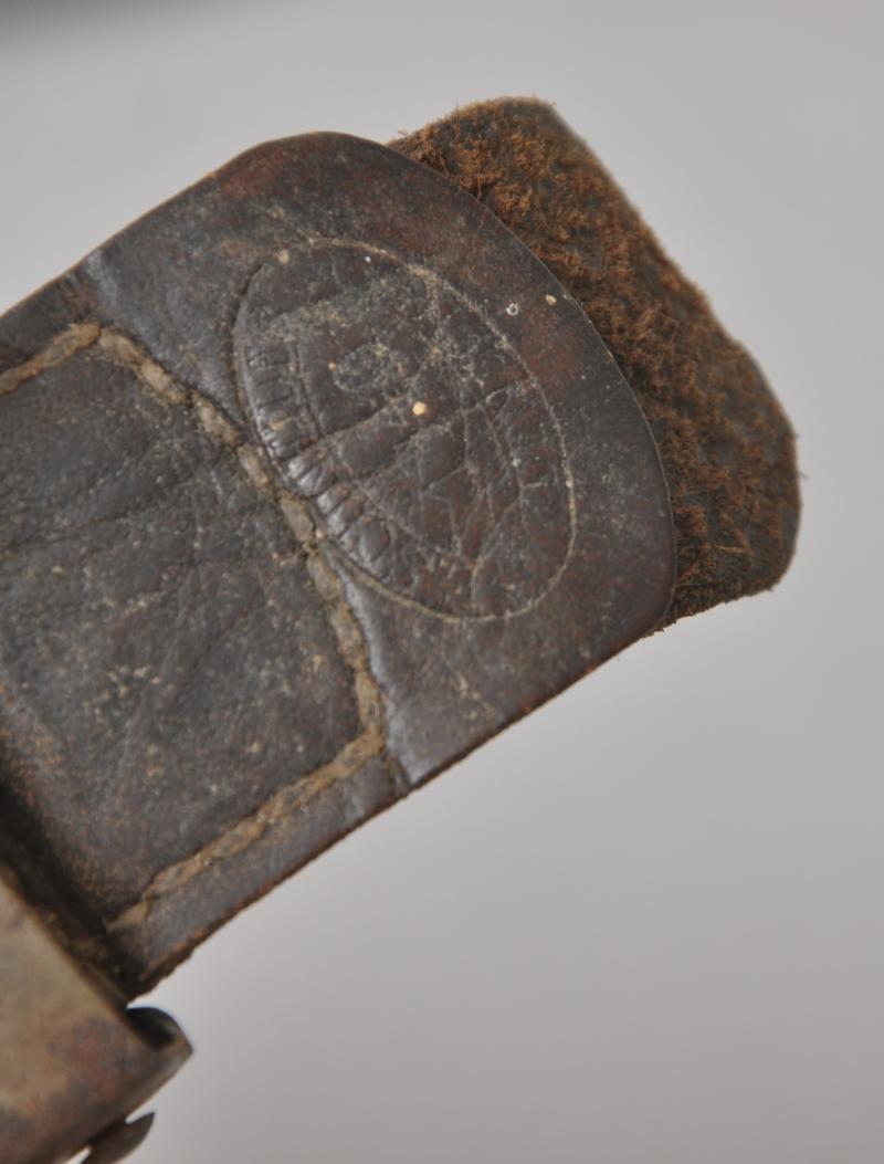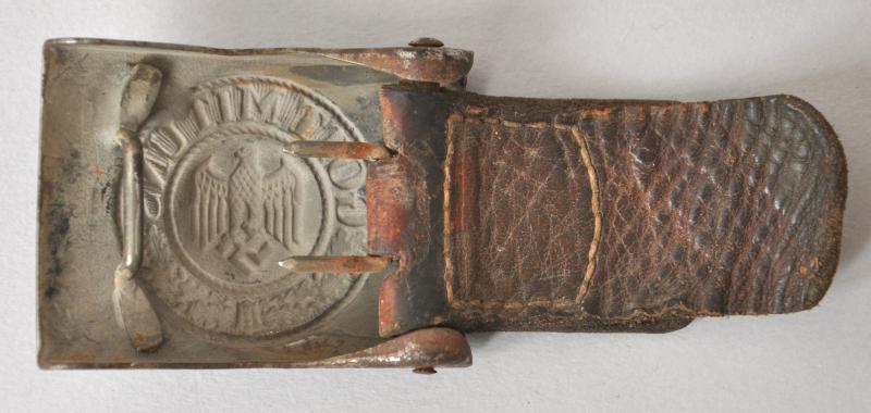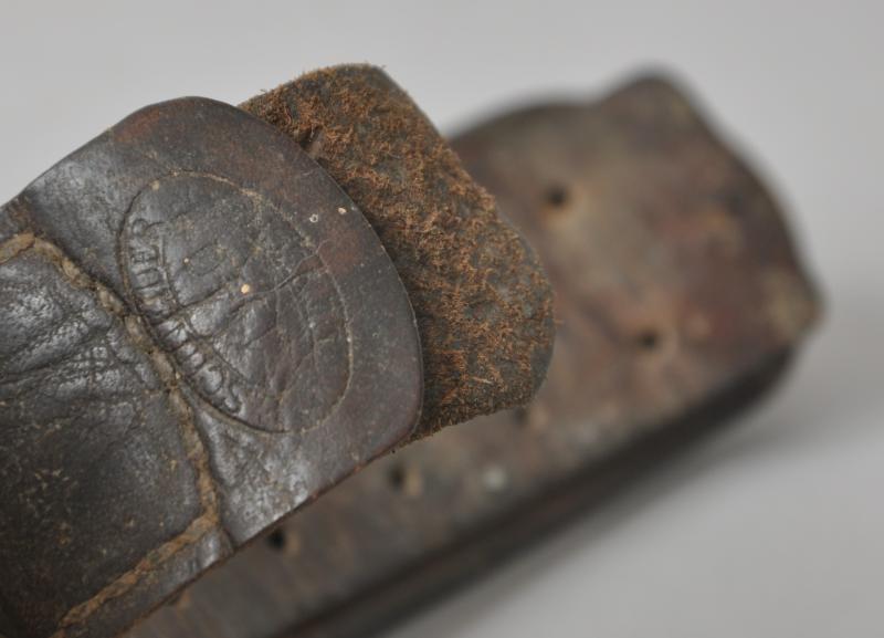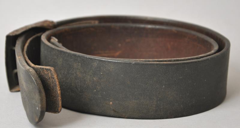 Belt buckle is of green grey painted steel with leather tab marked to the firm 'Schneider' & faint 1940 date. Belt leather is completely matching in age & wear to the buckle with size mark to one end ' 190' . Faint maker to belt leather end with date '1943'.