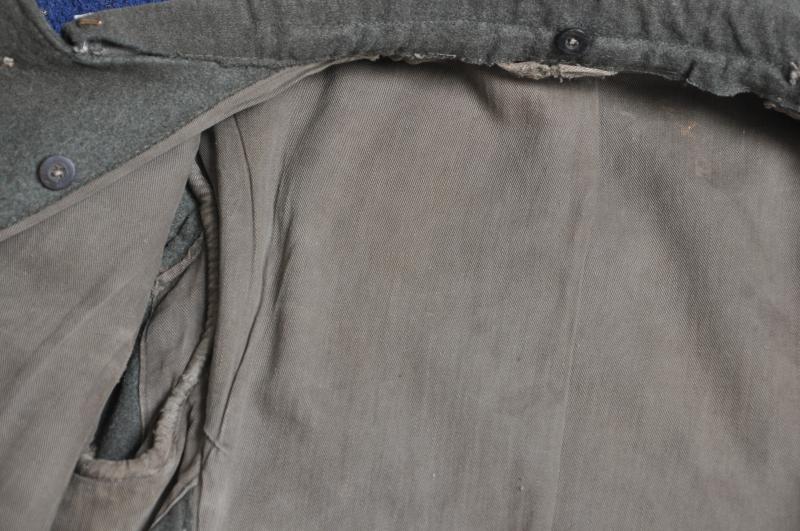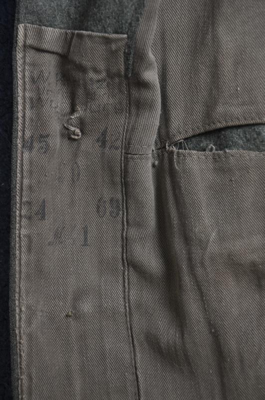This tunic shows all the signs of a heavily field used piece ideal for a combat infantryman mannequin with wear to the nap of the cloth & a faint outline around waist where belt was constantly worn. With grey collar , four pleated pockets , scalloped flaps & a five button frontage this is the classic M40 model. A veteran of the Russian Front as denoted by the 'frozen meat' medal ribbon there are also two further award loops to left breast pocket most likely for an Iron Cross. Grey on green bevo breast eagle is neatly handstitched in situ with universal tabs & NCO tress to collar. Two of its horn buttons remain for attachment of collar liner. Interior lining shows heavy service wear with dice marked size stamps & manufacturer ' W.Kreulze Uniformfabrik Wurzburg ' . The depot stamp 'M41' denoting 1941 is also visible.