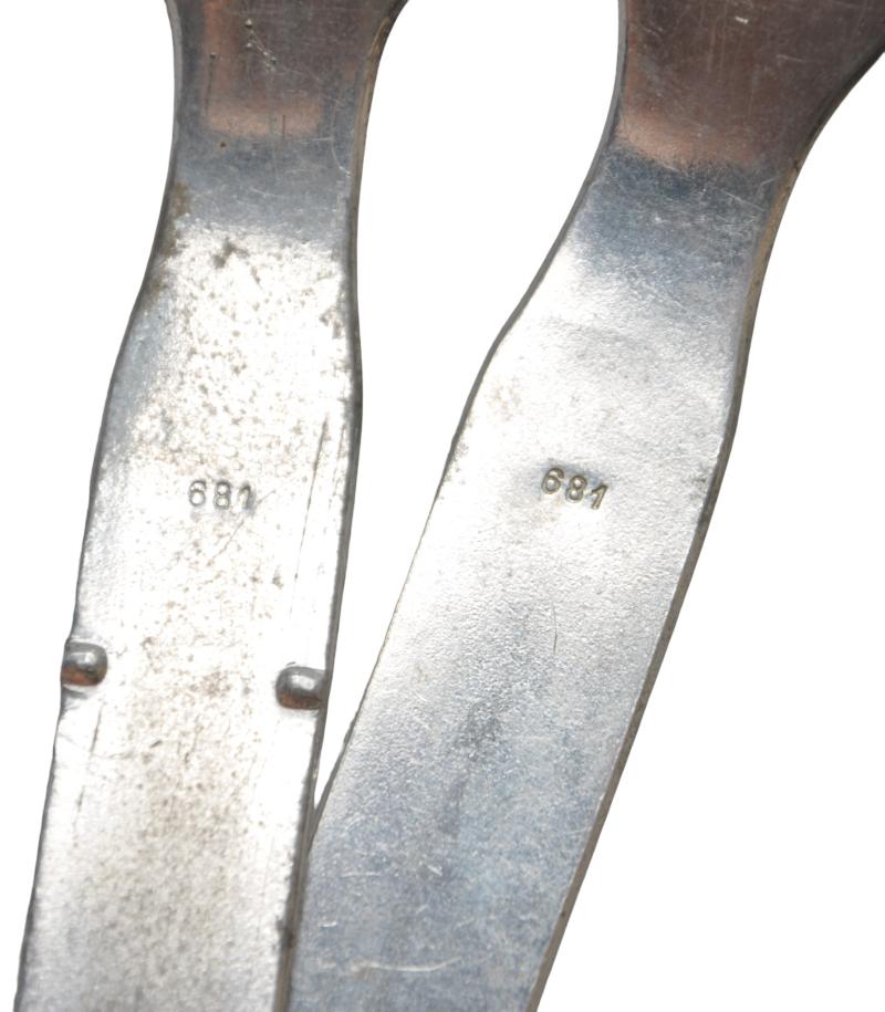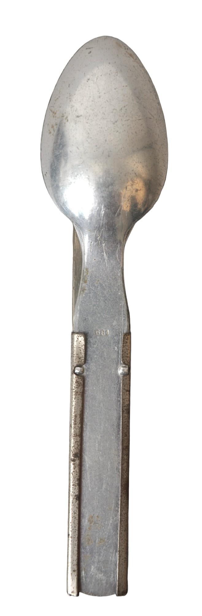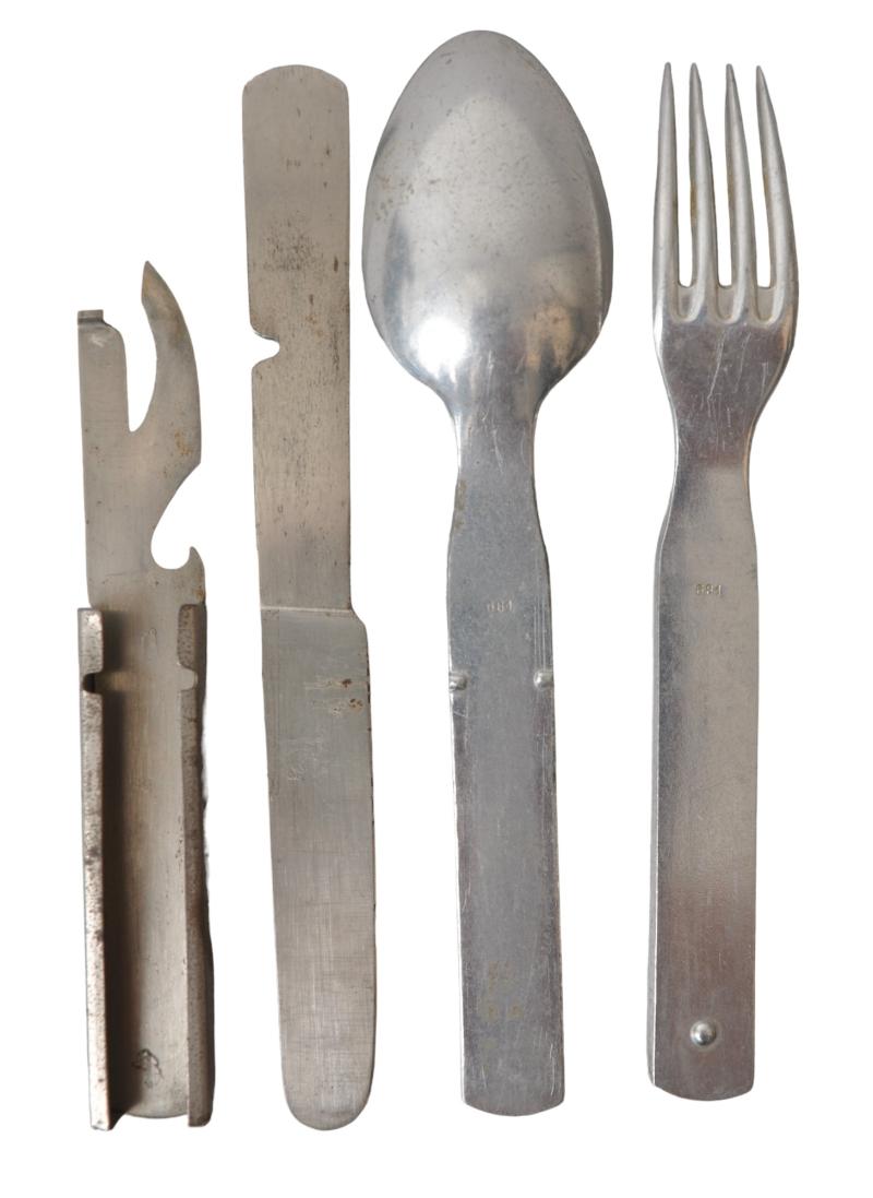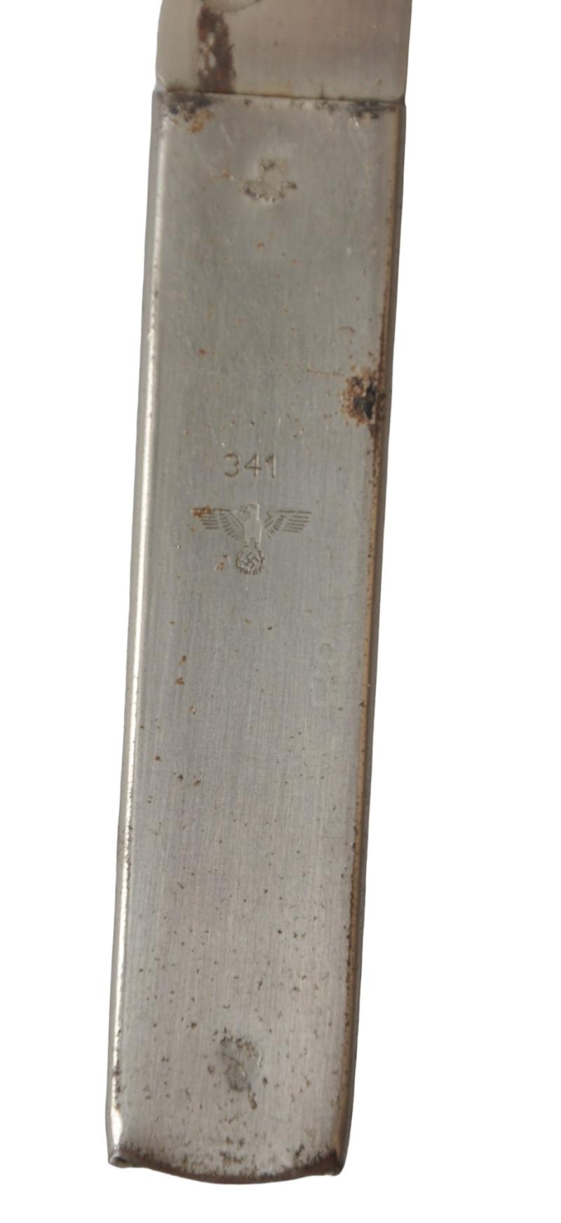 A German knife , fork & spoon set with eagle & swastika marking to can opener & number 341. Later examples were not all marked in this way most just having a three digit number as is the case here.