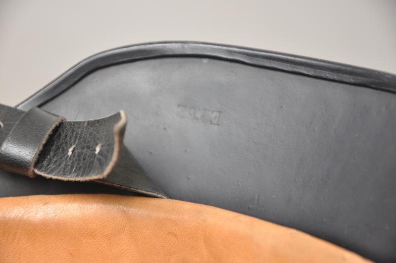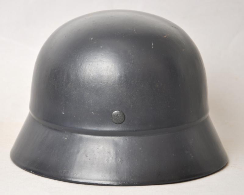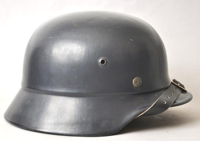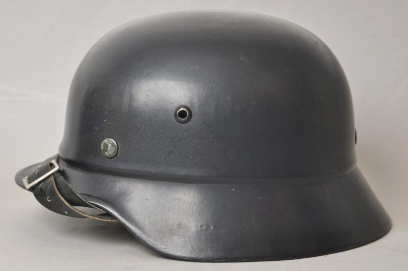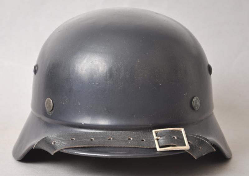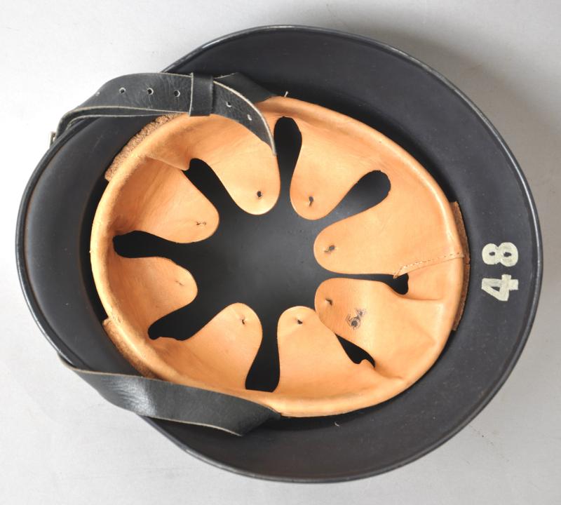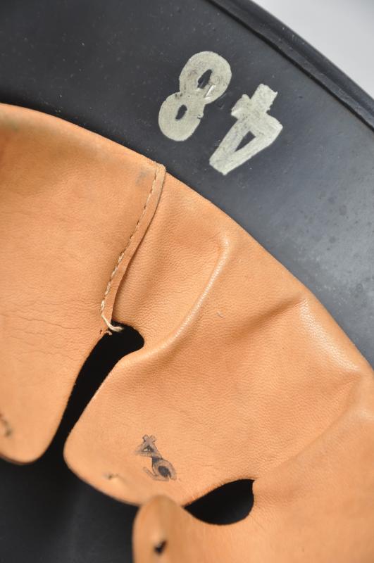 These M40 helmets had failed to pass the stringent Wehrmacht quality controls for ballistic integrity & so were reworked with the addition of the raised beading around their circumference in order to readily distinguish them from satisfactory helmets. Although sub standard combat helmets they were deemed suitable for issue to Home Front personnel & as is the case here had a satin dark blue paint finish applied with a Luftschutz decal that was at somepoint later removed . This may well have been due to being used by another branch of the Civil Defence personnel , wartime photos show some beaded helmets in wear with decals & some without. This specimen has a low quality Size marked 54 leather liner & chinstrap fitted which is typical of several variants that can be found within these civilian issue examples. The number '48' can be seen to rear rim most lkely denoting a crew number .