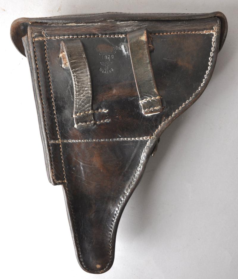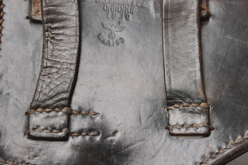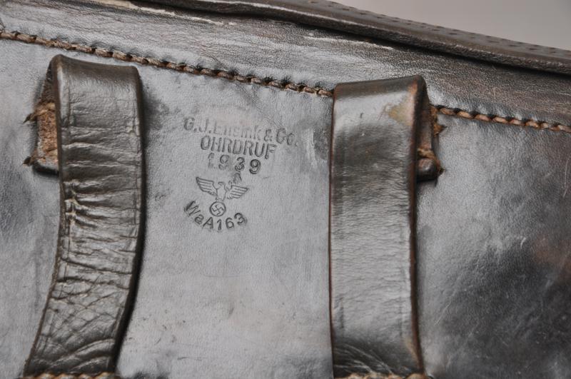 Black leather showing moderate wear with magazine & tool compartments intact. All stitching is firm & 100% original to it. Rear belt loops never interfered with & are firm . A clear eagle & swastika waffenamt stamp can be seen with manufacturer & date 'GJ Ensink & Co Ohrdruf 1939'. There are two names to underside of flap 'VEALEY' & 'Tate' .