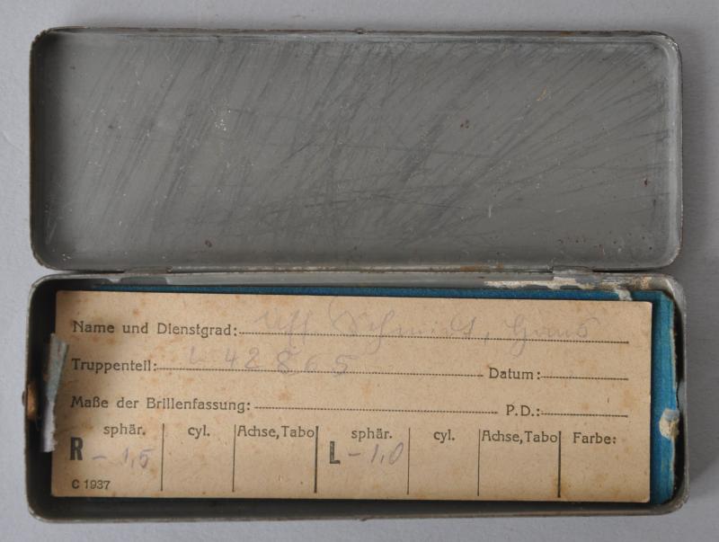 German soldiers spectacles case marked 'Dienst-Brille' named to an 'Unteroffizier' on the prescription card insert.