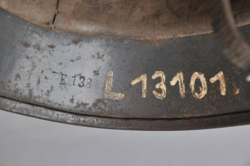 Still bearing its tricolour national shield the second pattern eagle is faint on the left side due to extensive wear. Its early factory painted dark blue/ grey is much evident to its entirety with minor surface chips & scuffs from heavy wear. All three of the liner pins are original & undisturbed . Underside of the helmets rim shows maker mark' NS64' with lot number 'E138' .The leather liner is totally uncleaned & left as it was found with the original drawstring allowing us to see the unit ink stamp to underside of the leather. The German Feldpost number of 'L13101' has been painted to underside of rear rim. The brown leather chinstrap is its early issue with LBA inspection mark ( Luftwaffe Bekleidungs Amt ) & the remains of a unit mark also . Buckle is of aluminium.