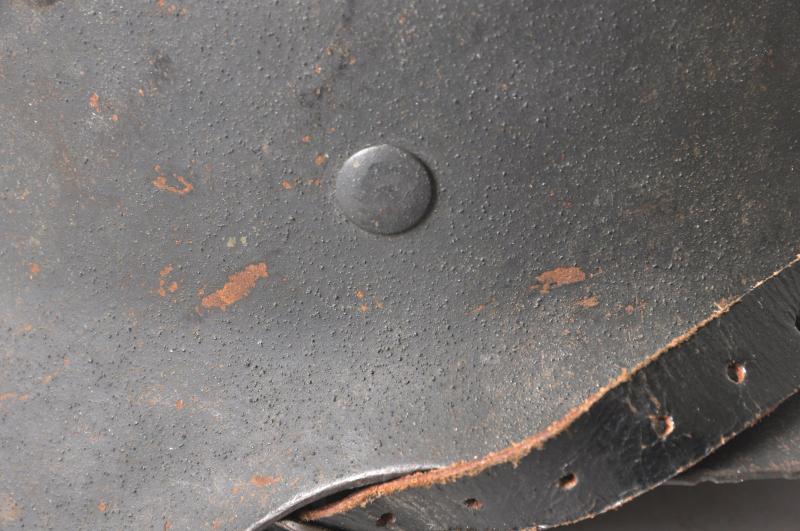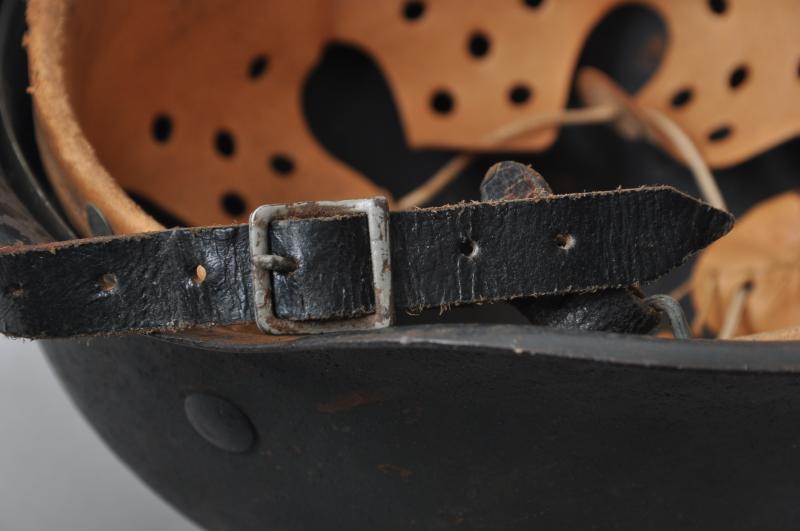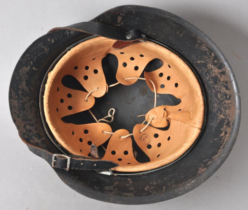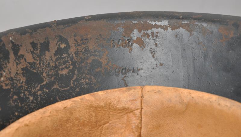 This helmet is painted in a heavily textured dark blue-grey with dotted wing variant Luftwaffe decal. All these features are totally correct for an 'HKP' manufactured helmet such as this. Underside of rim has the lot number '2979' & markings 'HKP62' for the firm 'Sachsische Emailler' which was formally 'SE' but changed to HKP during late M40 production. A search of the Brian Ice lot numbers book results in an exact match on these details for this helmet. Decals were dropped after lot number 3477 for this maker. The zinc metal liner band is dated 1943 with leather lining totally intact with no damage to tongues. Tightening cord still present. Its black leather chinstrap is original to the helmet & has an RB number visible to pointed end. There is a small non detracting stress tear to short buckle section , see image .
