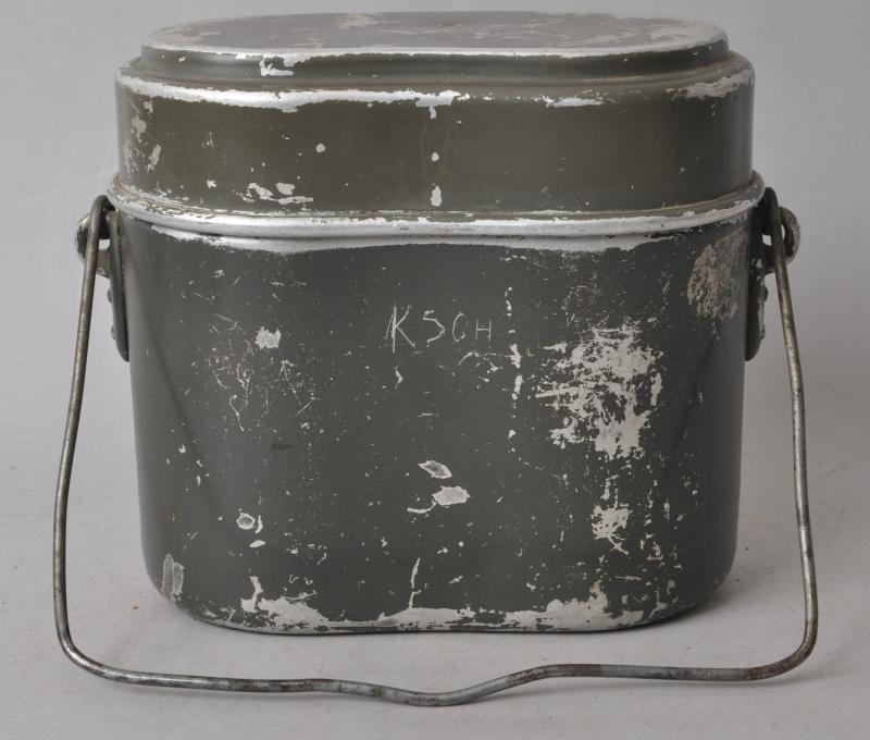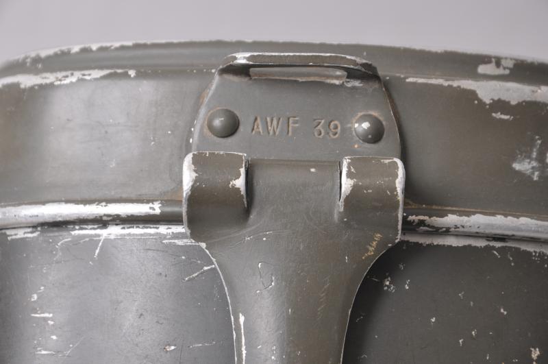 Standard German M31 messtin as used by all combat soldiers of the wehrmacht & Waffen SS with a good proportion of its original paint remaining . Marked to lid 'AWF39' & body having maker initials & date '37.