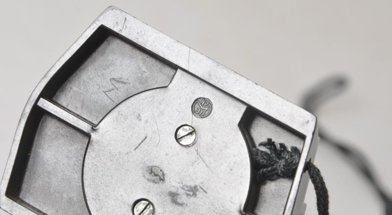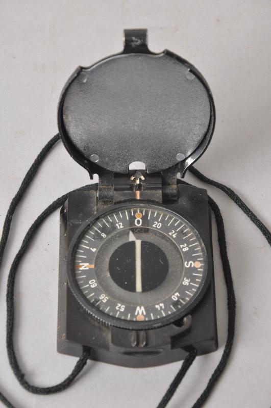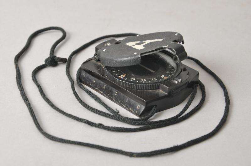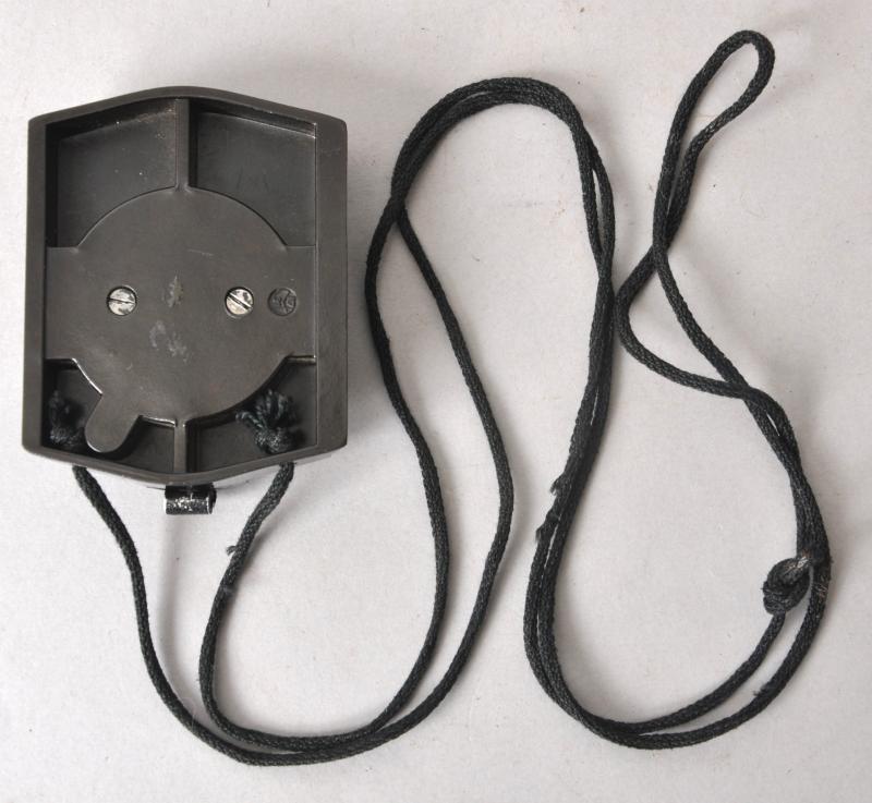 A black bakelite & metal marching compass complete with carrying cord. Marked 'A' to front with bakelite marking to rear.