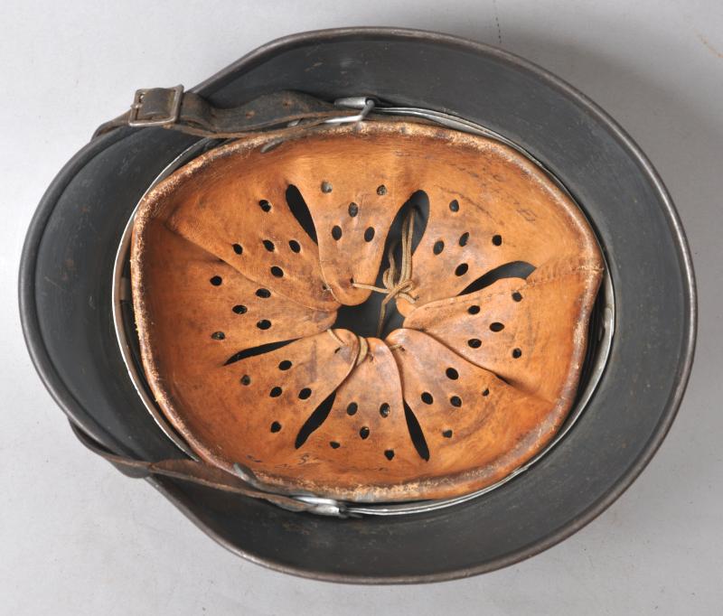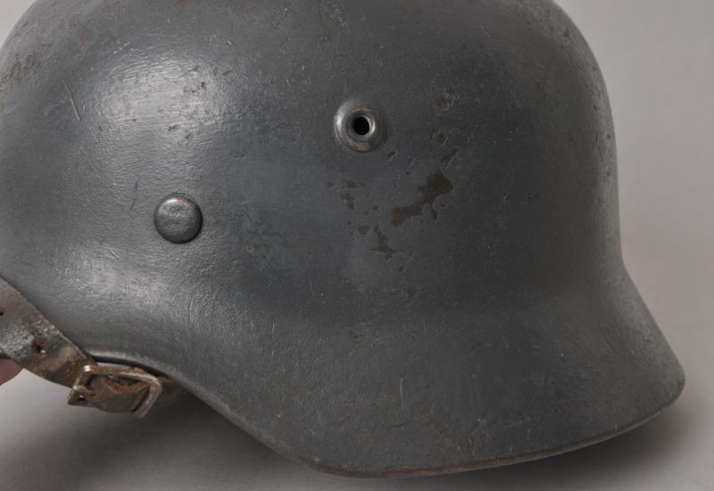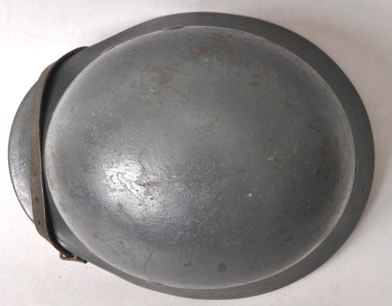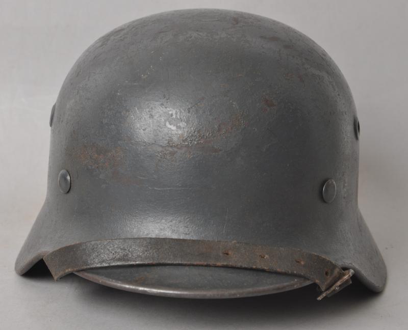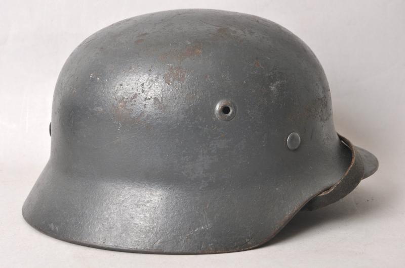 A German M40 Luftwaffe helmet with decal removed & original chinstrap intact.