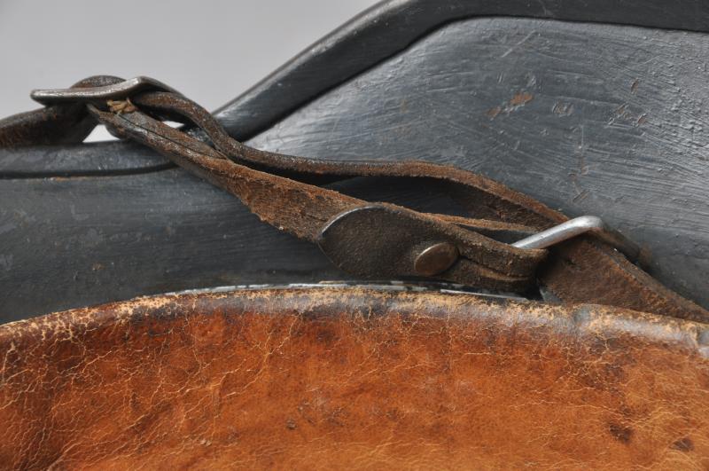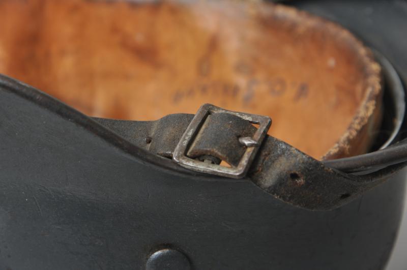 This helmet has a factory applied blue paint of the Luftwaffe with a second blue coat over this applied by brush. The ghost outline of a previous second pattern decal can be seen in obliging light this removed as per regulations. Fitted with a reinforced aluminium liner band the leather sheepskin liner is double named one being ' 'J.O.Skaland' & the other in German lettering which I believe to be 'Juttemann ' with number. Tigthening cord intact. Chinstrap has grey painted steel buckle with maker name & date 1940. There is a very small hardly noticeable nick to the leather where it comes over the front lip of the helmet. I am unable to discern the maker of the helmet due to the thick handbrushed paint under its rim .