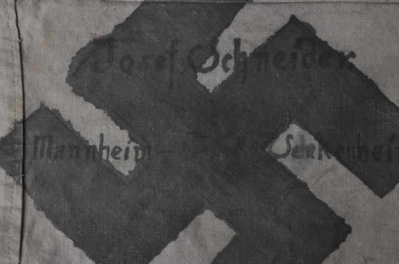 A German zeltbahn of WW1 origin used by paramilitary in the Third reich period with large swastika drawn onto it & owners name .