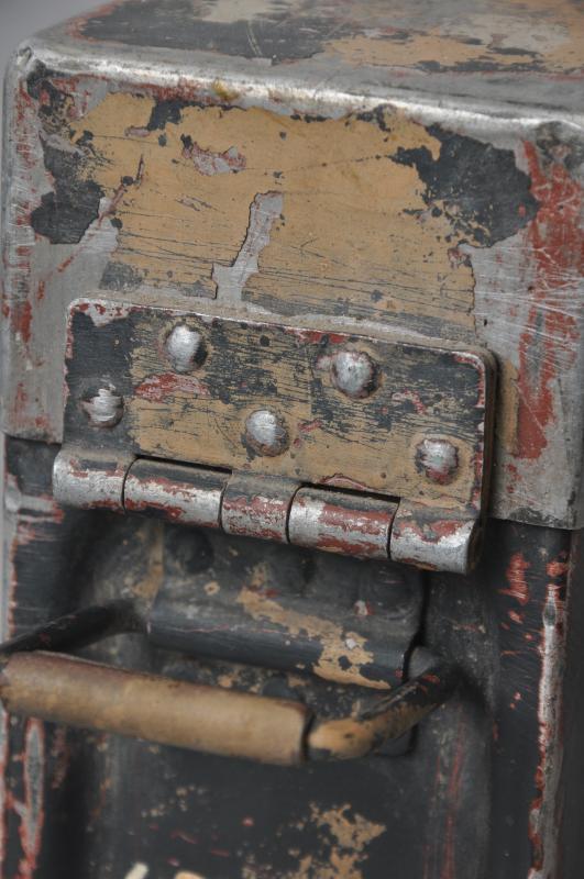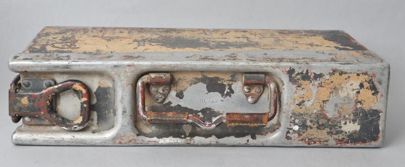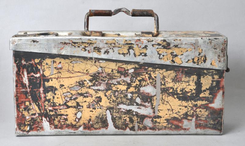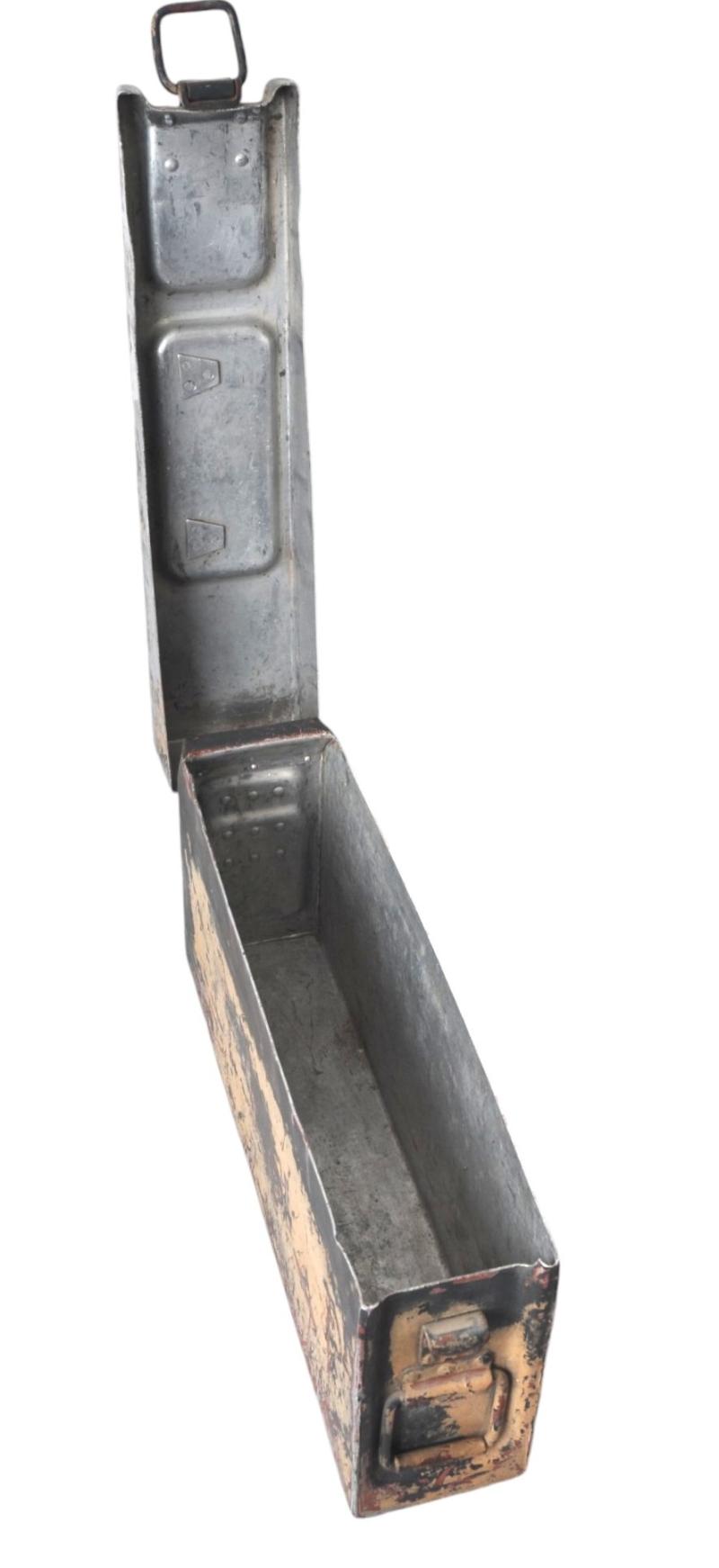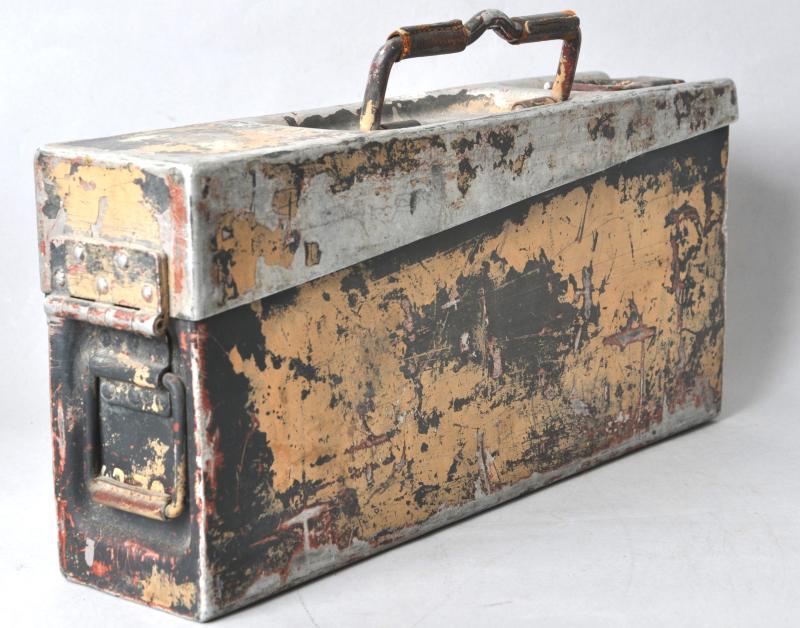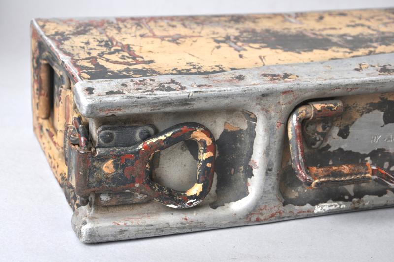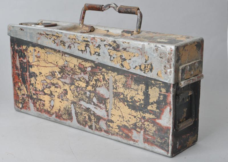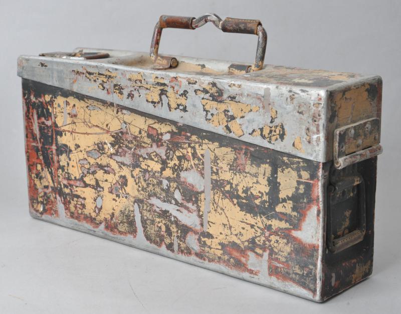 An aluminium MG tin factory painted in ordnance grey paint over red oxide then with remains of a sand camouflage applied over this .