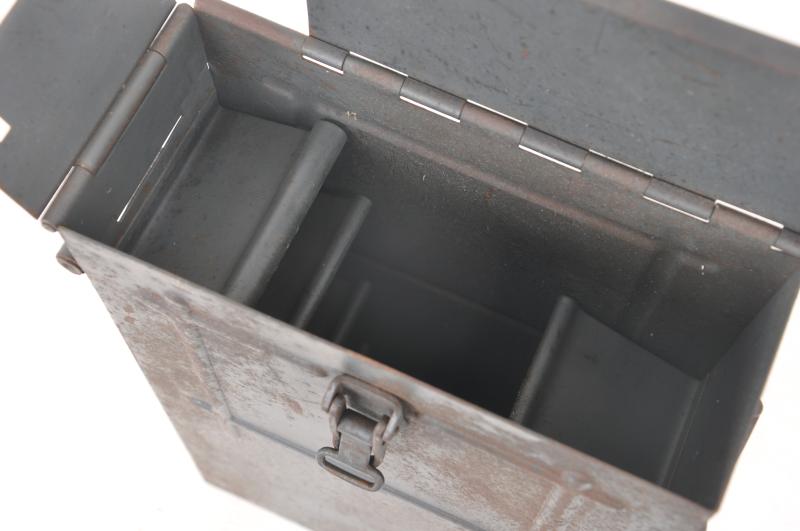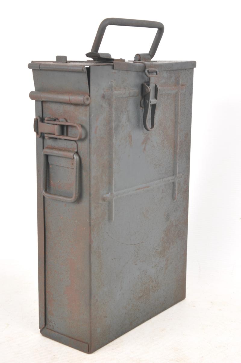 A very large amount of its original factory Luftwaffe blue grey paint remains . These well designed containers reduced the weight of a loaded belt by way of an internal shelf system in order to prevent malfunction of the Mg34 belt feed when firing.