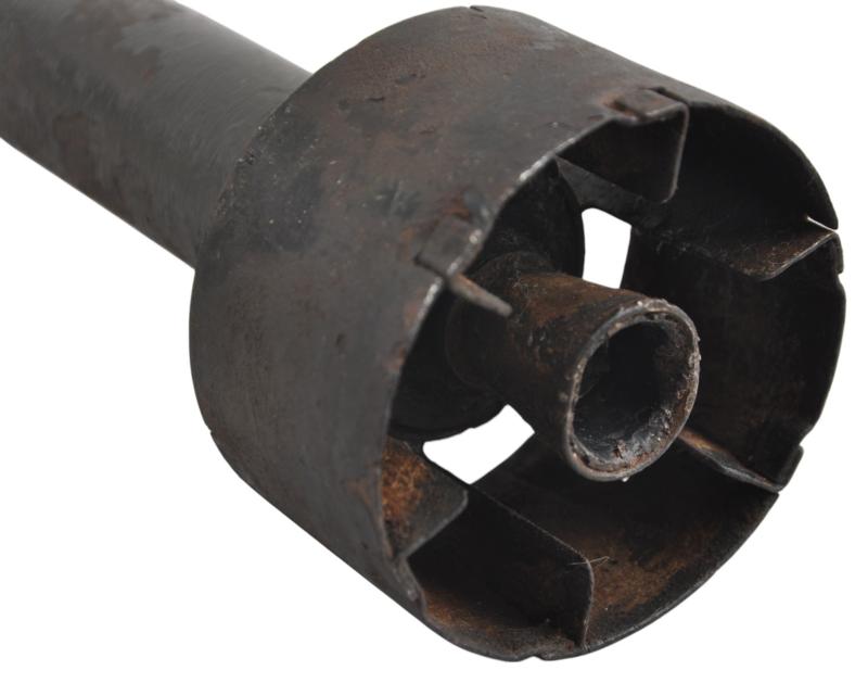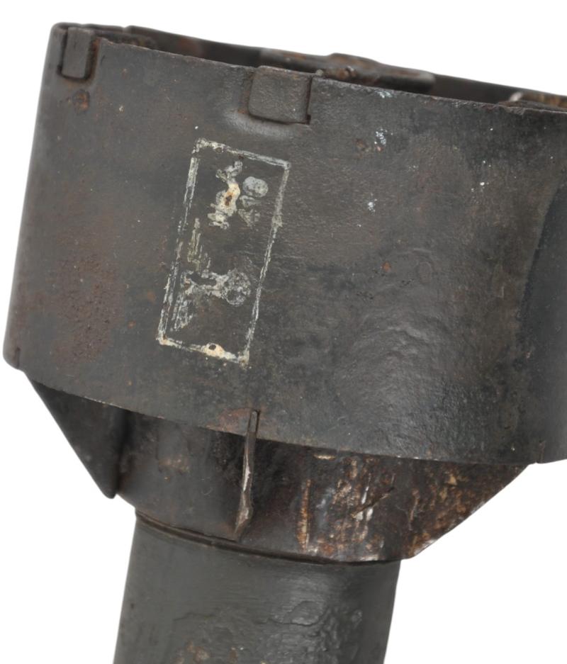 Very rare round for the German Panzerschreck ( Rocket firing anti tank bazooka ) which strips down enabling inspection of its empty interior. This piece has suffered the usual loss of some finish to its exterior & thus has been repainted in the most part with markings reapplied for visual effect. The tail fins section retains its original eagle & swastika marking. Bakelite nose tip present.