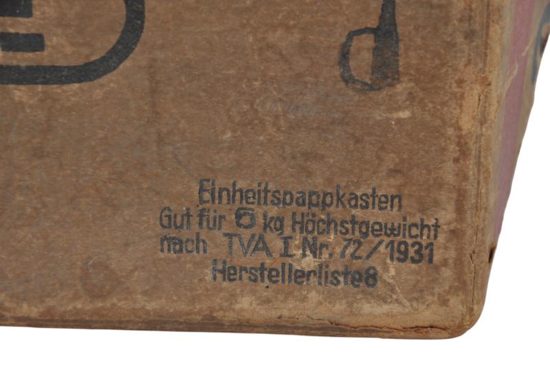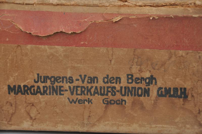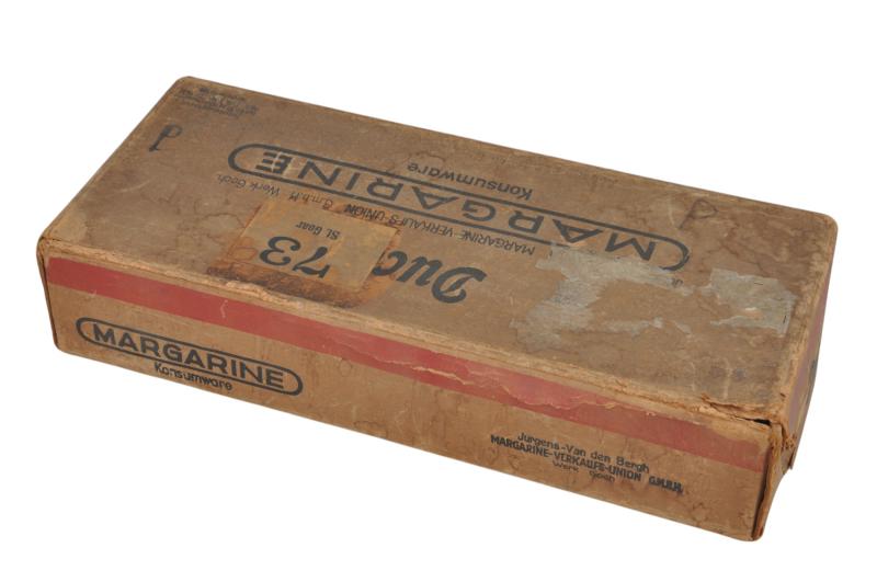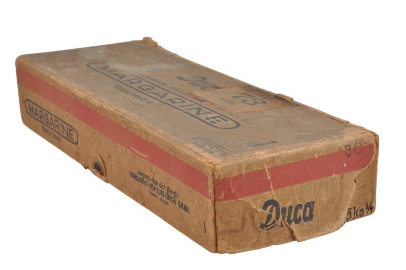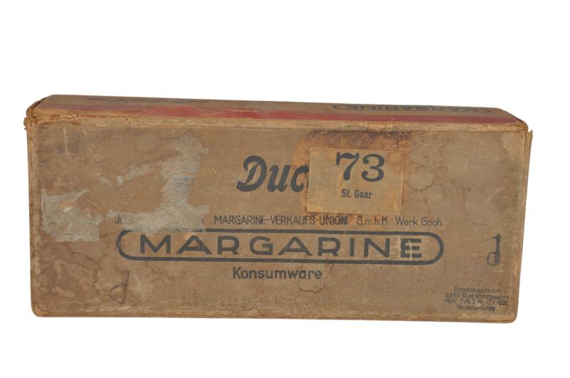 An original large sized cardboard Margerine carton . Margerine was issued daily to German soldiers as part of their fat ration carrried in the fat dish ( Butter Dose ). A very difficult to find Ration item.