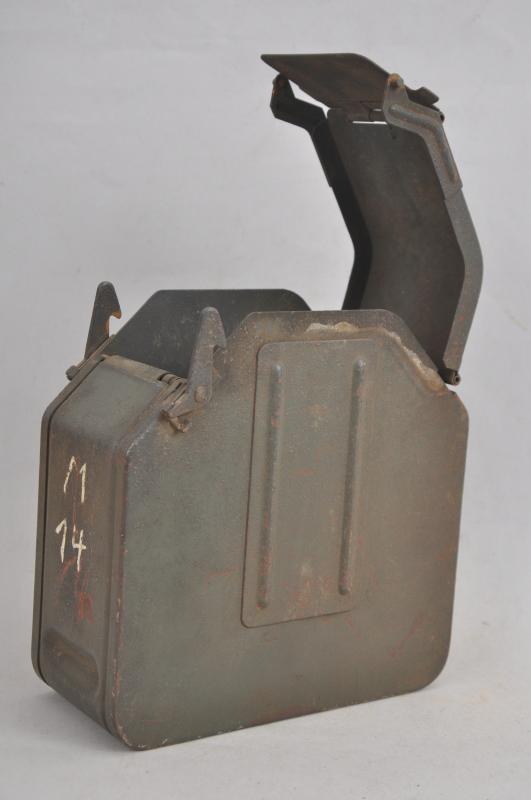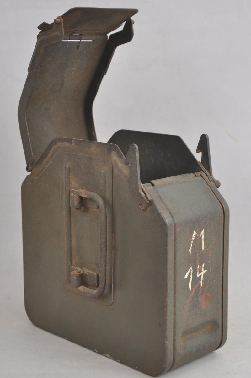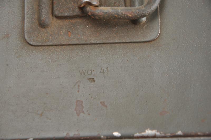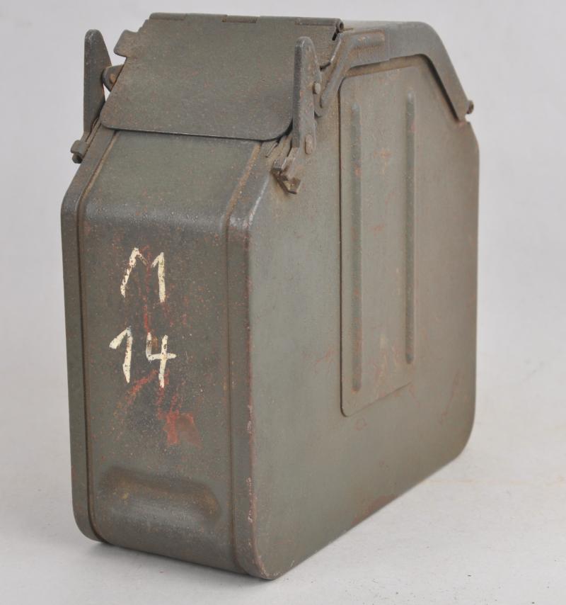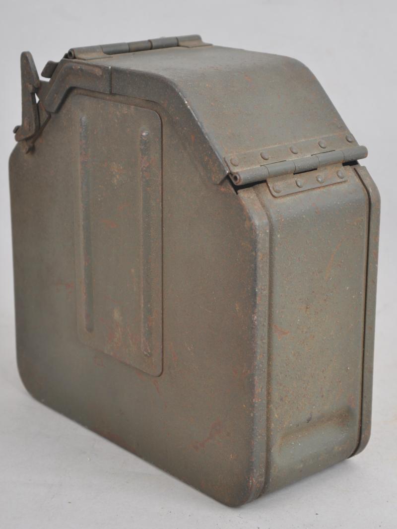 WW2 German vehicle ammunition tin for the MG34 ( Mount Zwillingssockel 36) in its original green factory paint with markings under the handle 'WC41' .Top opening & good condition.