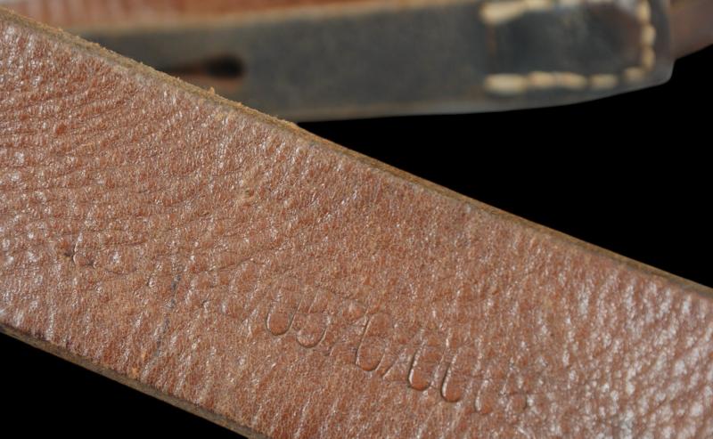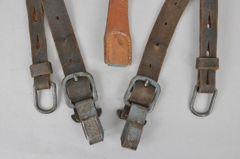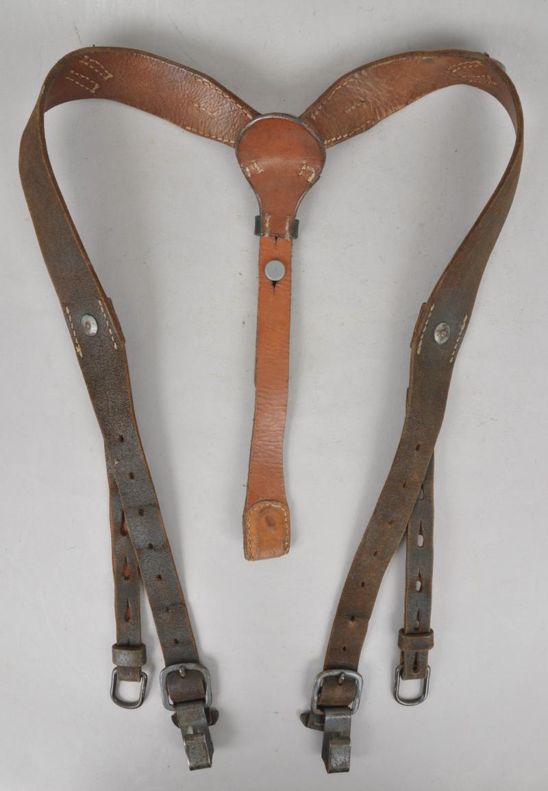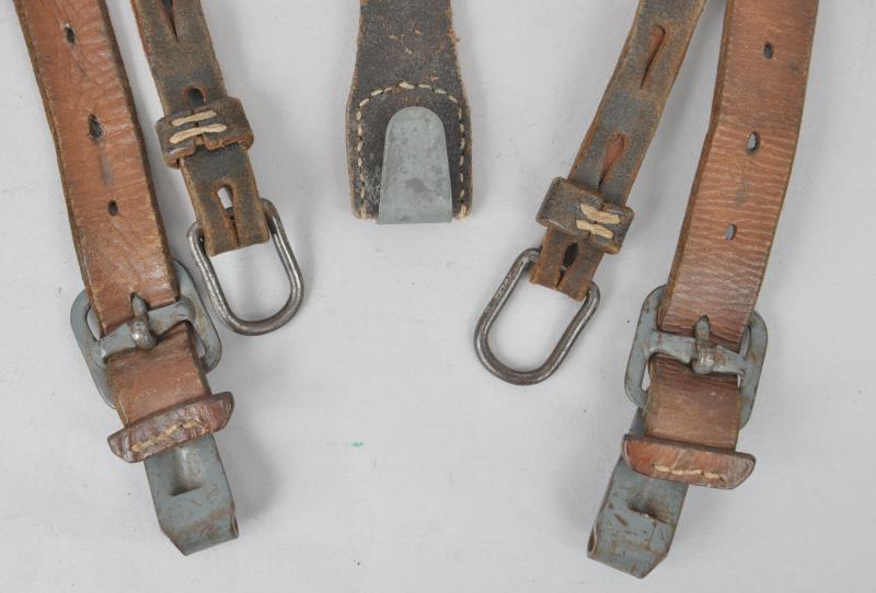 A textbook pair of German combat Y straps in black leather with grey painted metal fittings. Leather supple with central yoke intact & RB number to reverse.