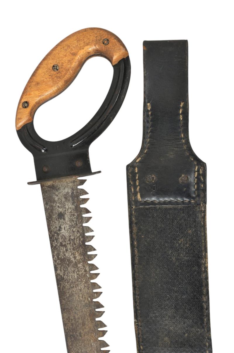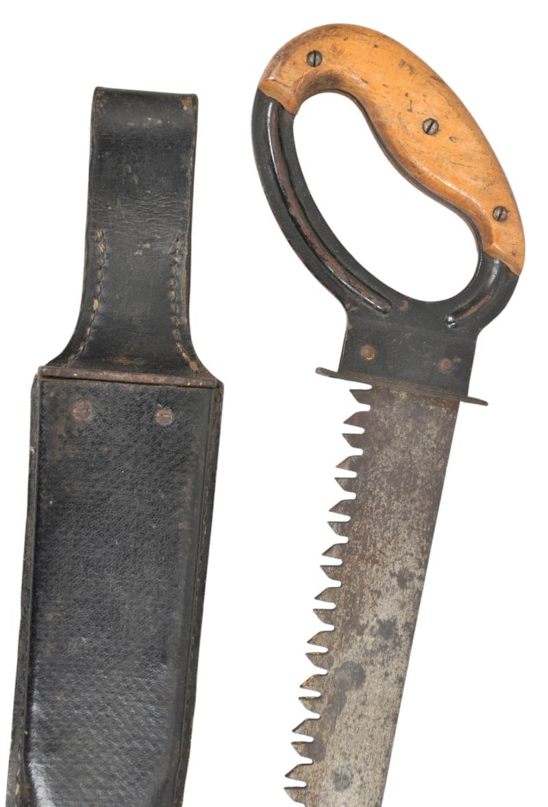Wood handle of the saw is fully intact with prestoff case good & belt loop intact. Faint markings visible to rear of case with date of which only the first three digits ( 194*) are intact.