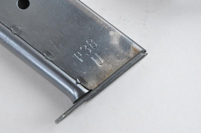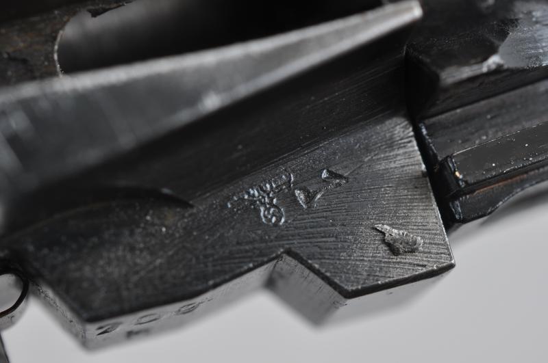Matching numbered P38 automatic pistol of wartime manufacture with original black Bakelite grips & correct wartime issue magazine. Three letter maker code & date 'ac41' for the firm 'Walther' with eagle & swastika waffenamt markings to frame. It is in excellent overall condition with a good smooth mechanical action capable of being cocked , stripped & dry fired.