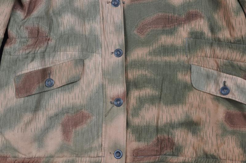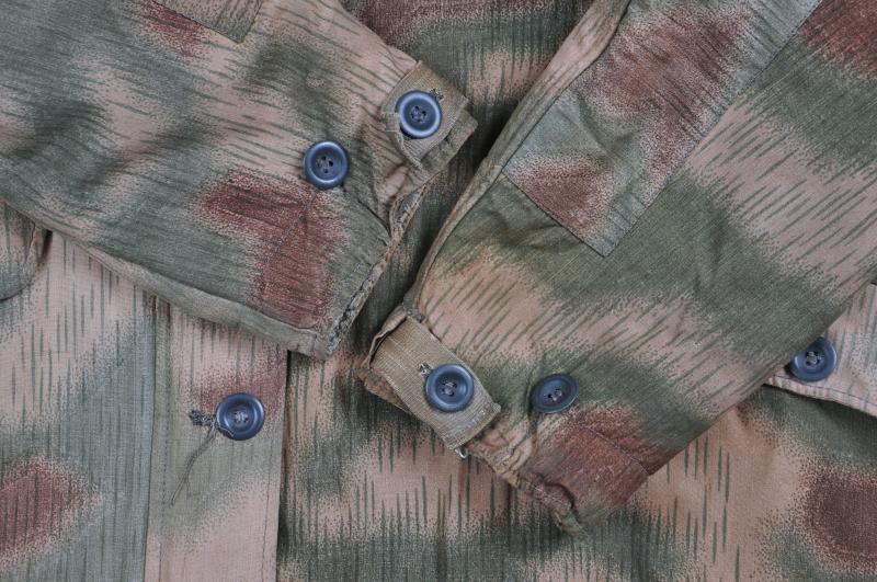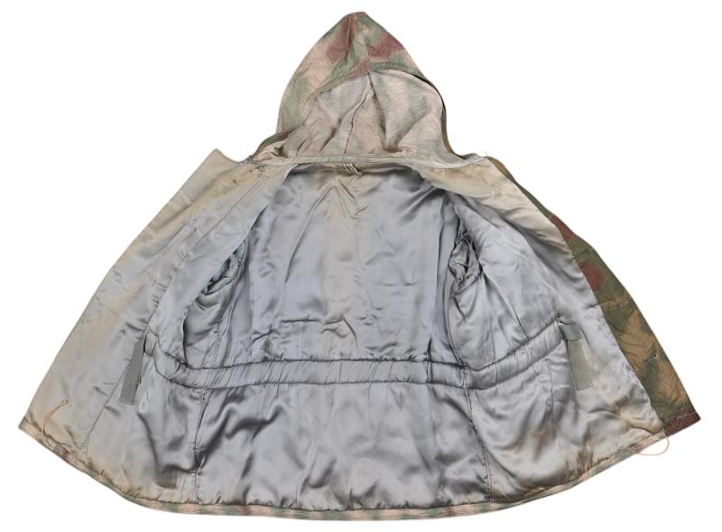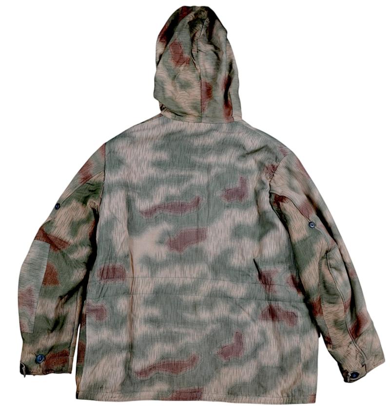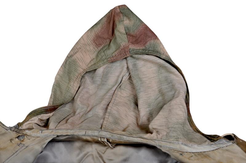 As is typical with camouflage garments of the midwar period onwards different panels of material have been used in its construction these slightly differing in shade & pattern. The large dished buttons are all 100% original sewn to the parka as are the identification band buttons to each sleeve. Tightening cord to hood & bottom hem both present with both adjustment buttons to each sleeve also original & present.