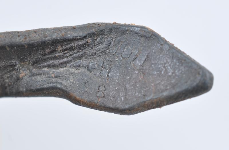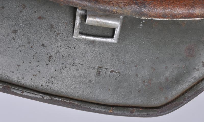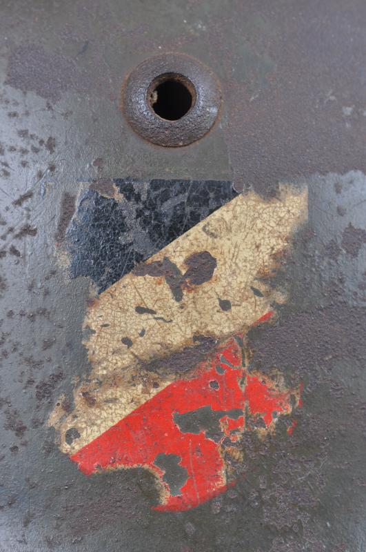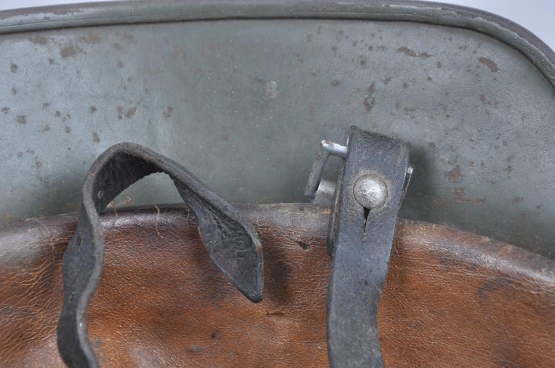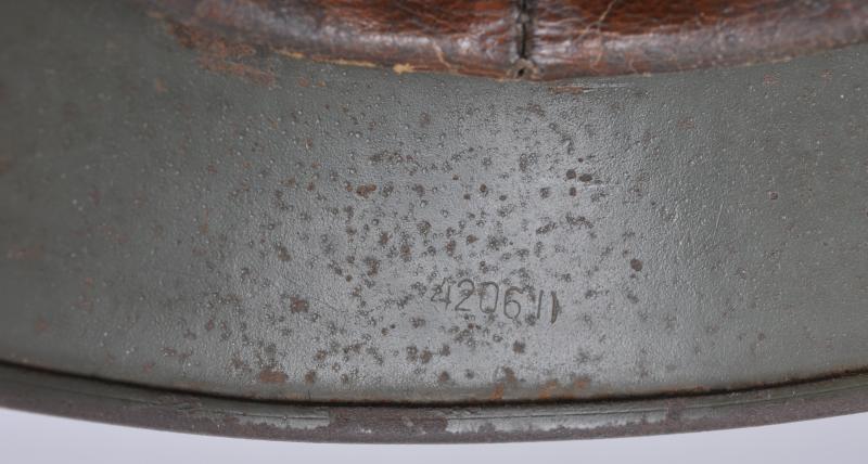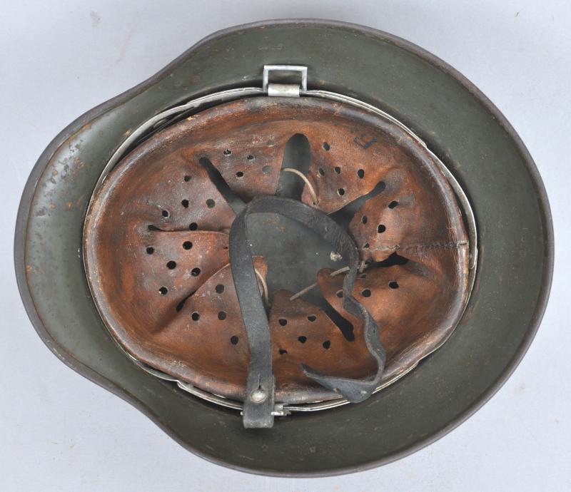 Helmet is still in its early apple green paint with army decal & national shield still partly intact. All three liner pins are undisturbed & totally original to the helmet . Underside of the shell gives maker mark & size of ET62 with lot number 4206 . Interior has reinforced aluminium liner band dated 1939 with drawstring intact. The leather liner has the soldiers name ' Rockinger Frz' written on it presumably the last part being 'Franz' . Lastly the long section of the chinstrap remains & with the date 1938 visible to its pointed end.