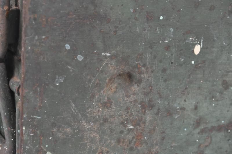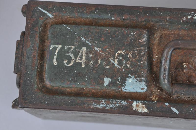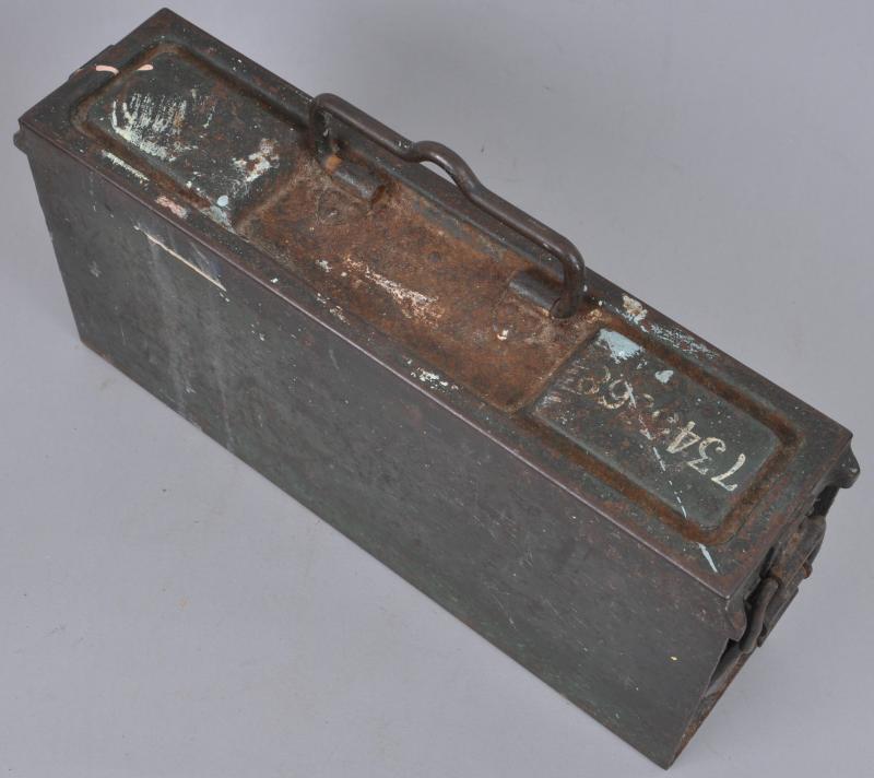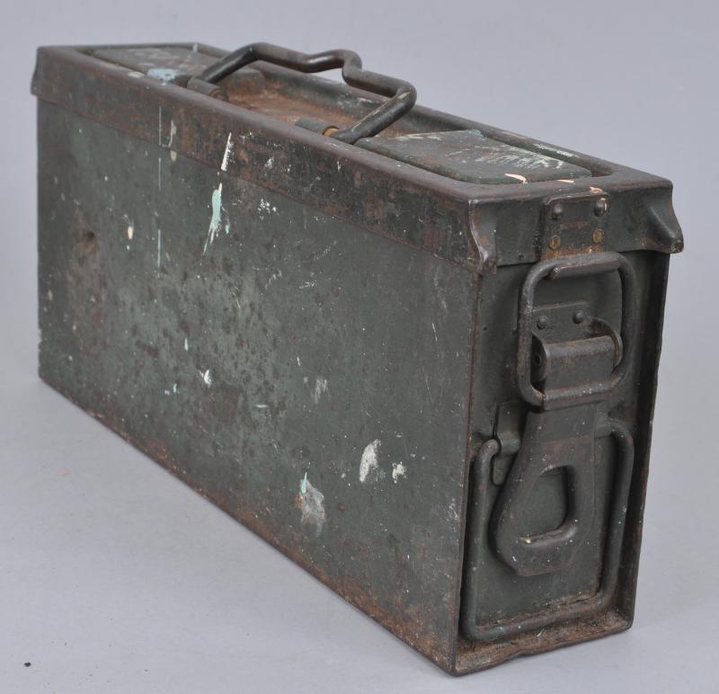 WW2 German steel MG tin that has evidence of grenade blast to one side . Factory painted in dark grey & with number painted to lid there are some paint splashes from postwar shed storage.