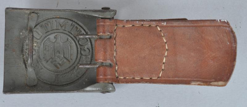 An excellent German army belt buckle with leather tab & much of its green factory paint finish still remaining.