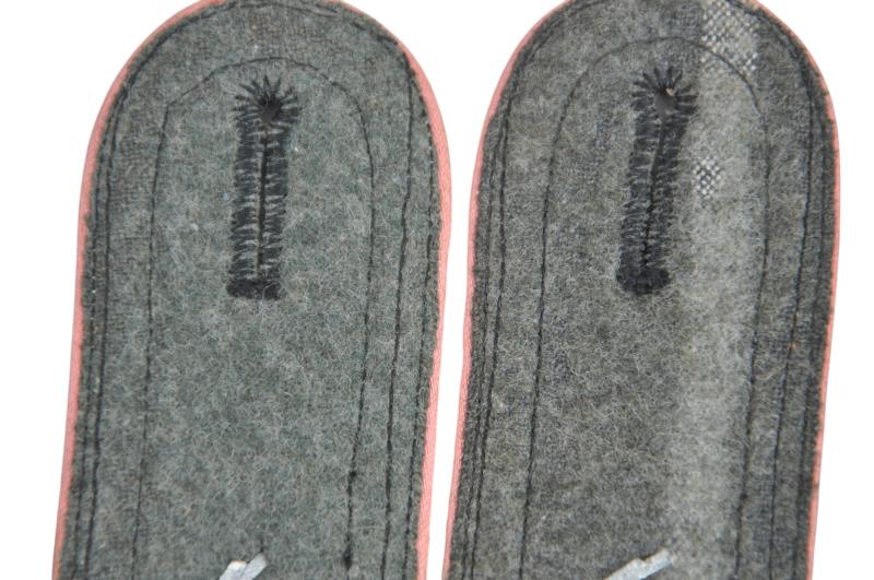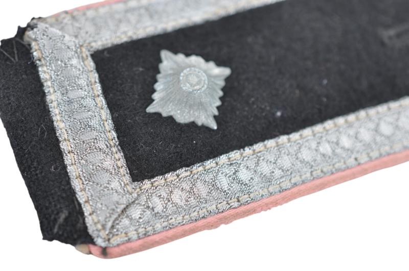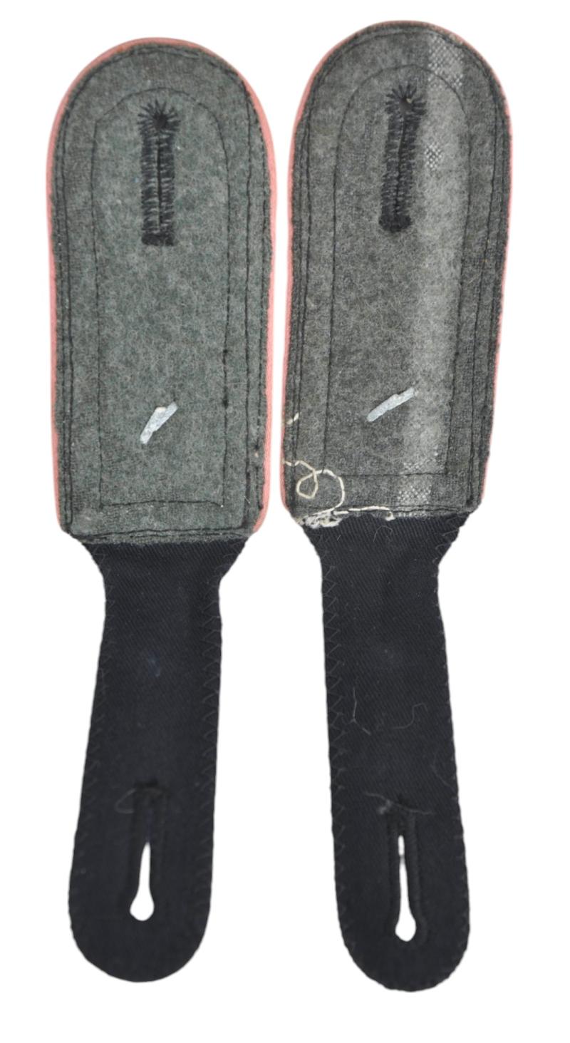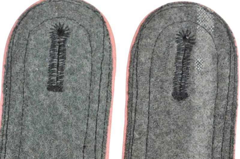 Black wool construction sew on shoulder straps with diamond patterned, NCO’s tress and a single rank pip and pink rayon waffenfarbe. The strap signifies the rank of SS-Scharführer serving with a Panzer unit.