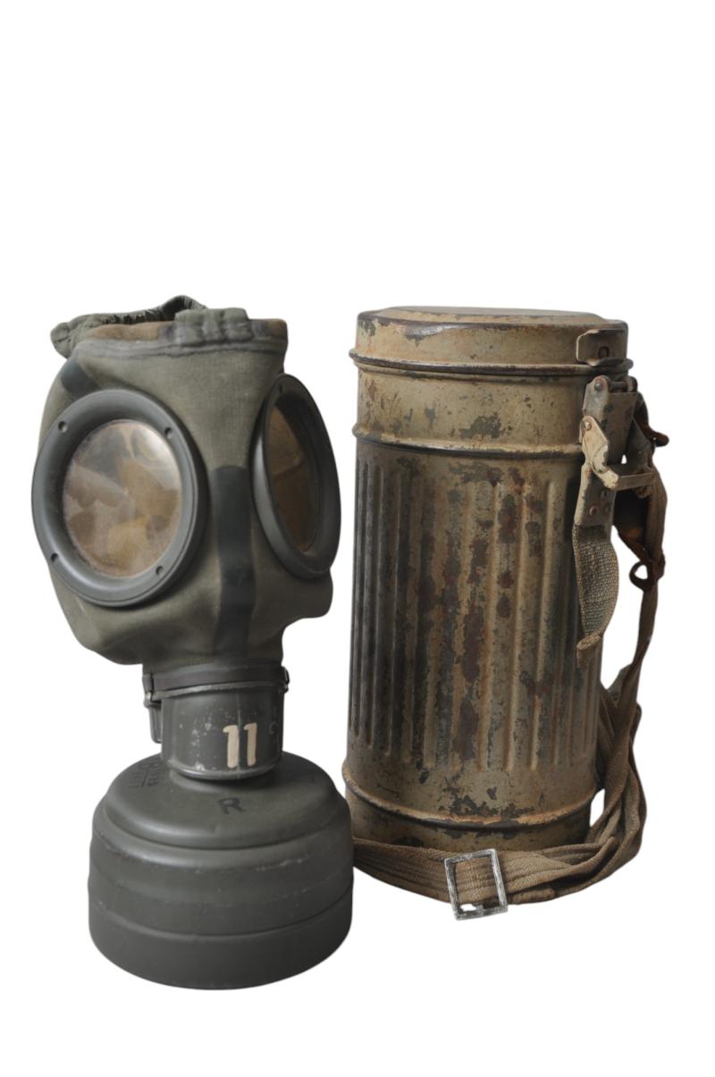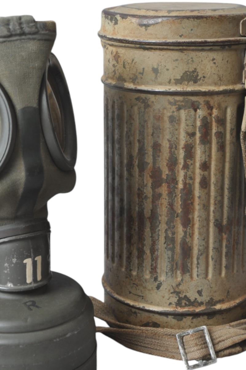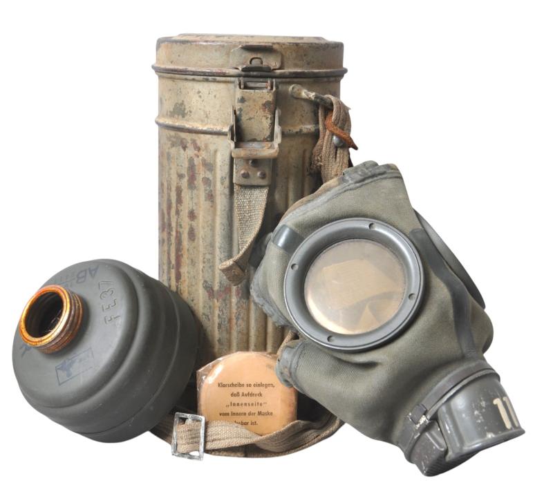 Rare tan camouflage German gas mask canister complete w all original carrying straps, mask & spare eye lenses.