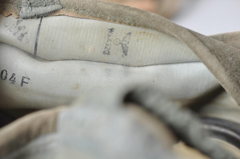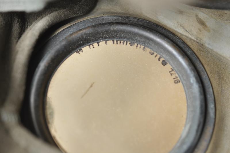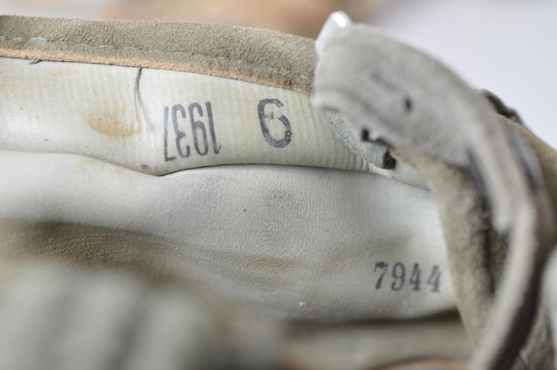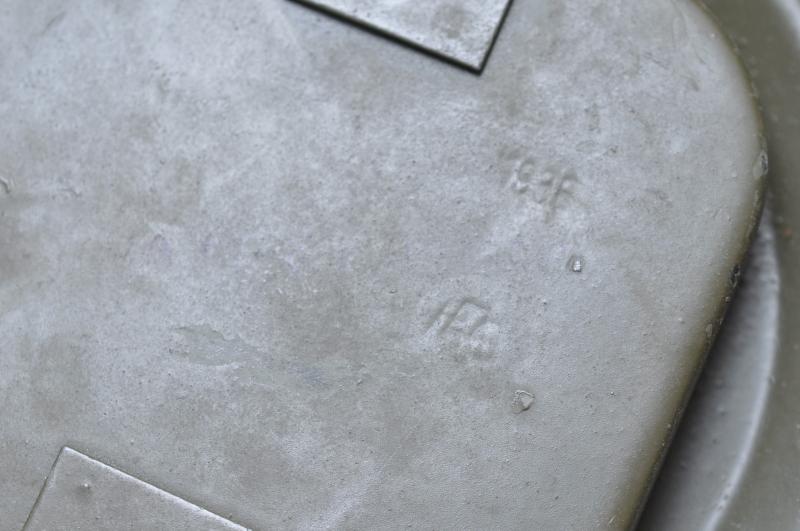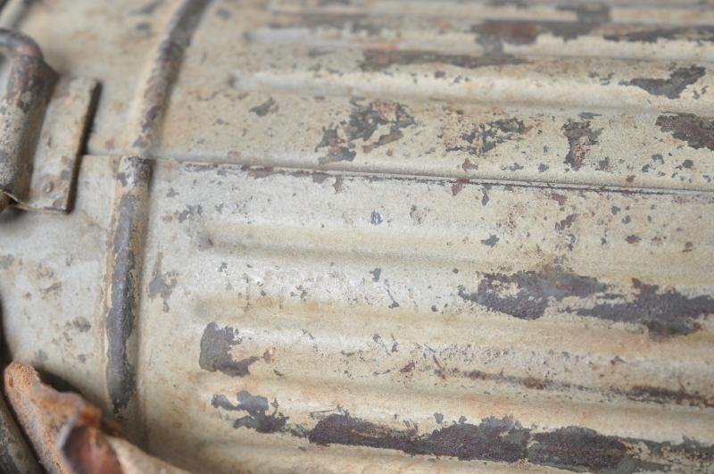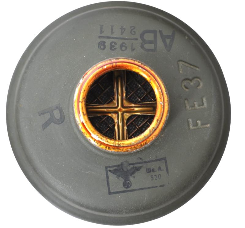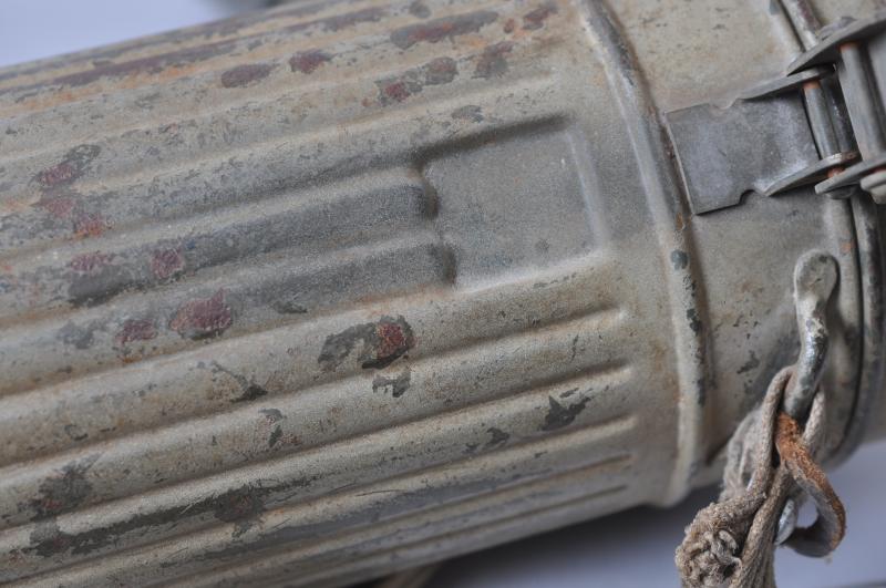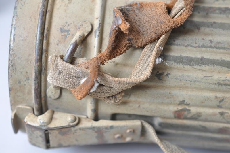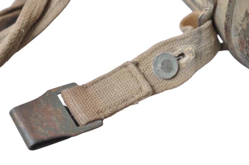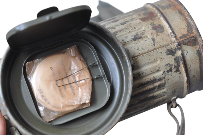 The tan camouflage paint has been applied by pistol spray with the bottom of the tin still green. Most likely a number of these were stood up in a row & painted at the same time it being unnecessary to create more work by painting the bottoms as well. I have attached makro images of the paint. This is the early type of tin with latch , there is a 1936 date to spare lense compartment. Both long & short carrying straps are original to the tin this evidenced by the short belt hook being of green painted brass as per these 1936 dated productions. Gas mask itself is dated 1937 with eagle & swastika waffenamt marking to inner edge of facepiece. Fe 37 filter still has eagle & swastika marking & retains almost all of tis factory green paint.