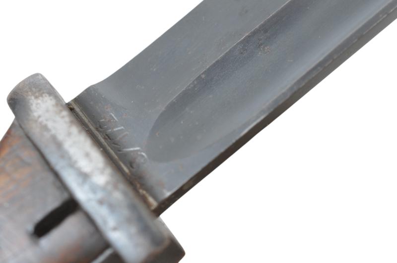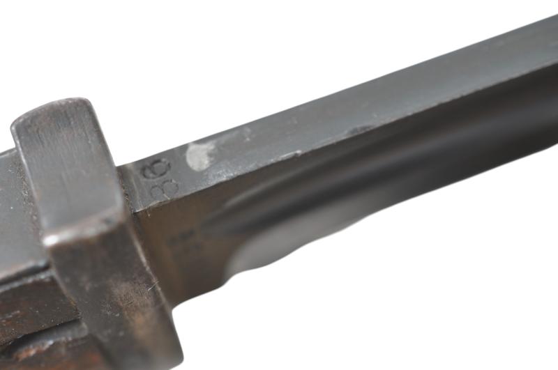 Early example K98 bayonet with ricasso of blade marked 'S/172' & with '36' date to back of blade. Wood grips showing expected moderate wear with functioning pommel catch. A good amount of blueing remains to blade.